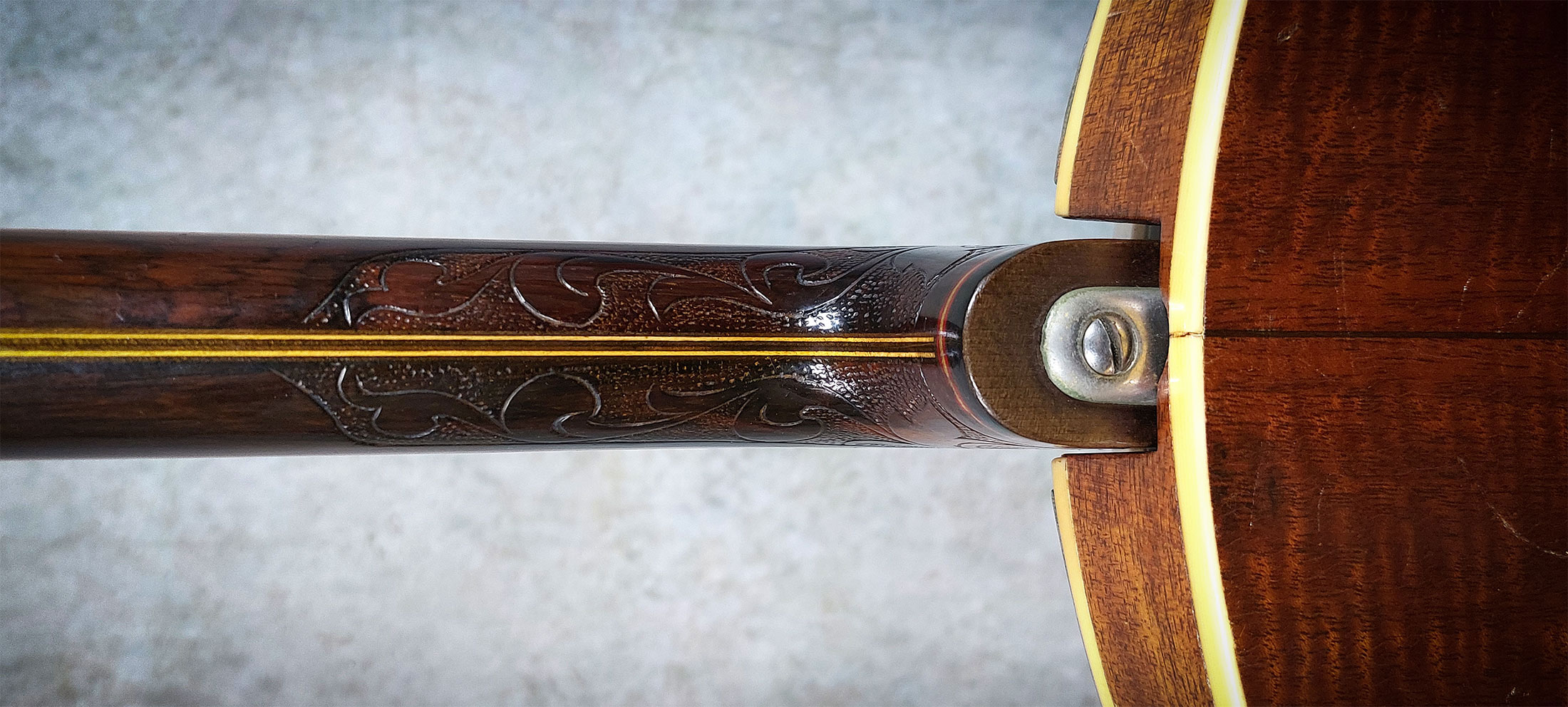 Fancy higher level CiD 19 fret tenor banjo built in the 1920’s in Germany. Engraved gold plating and fancy wood marquetry on the back side of the resonator, elaborate pearl inlay floral patterns… check it out!