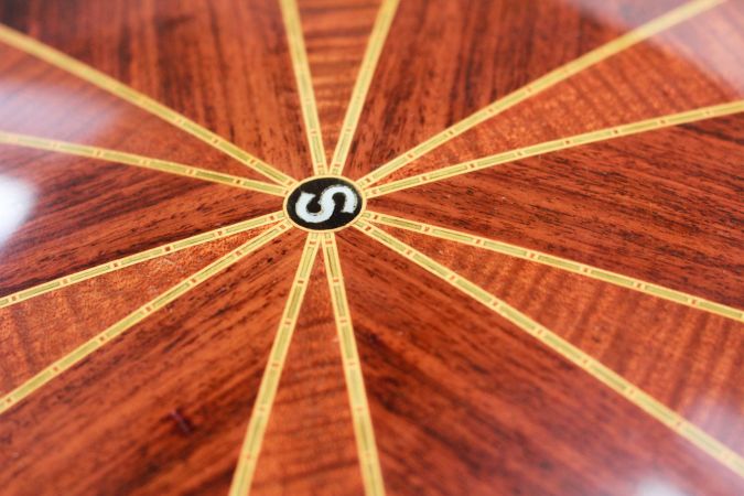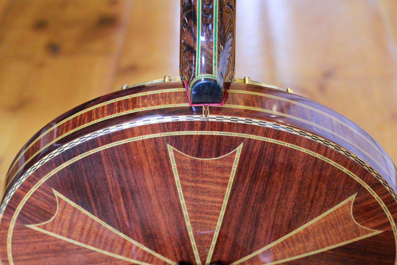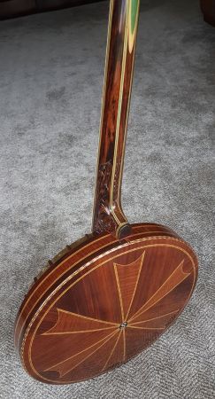 This Wondertone D sold for $280 which was the top of the line model. It features a maple rim and resonator with figured rosewood veneers all around and a 9-piece Brazillian rosewood neck with centre pearwood and maple laminates. This model incorporated an exquisite, beautifully carved heel. Gold plated geared tuners and fancy inlays in the fretboard and headstock. This particular model has a “S” inlayed in the resonator which I haven’t seen on other models. I have to assume that the specifications changed frequently, particularly during the 1930s when economics would have driven B&J to make their instruments as affordable as possible.