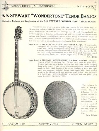The Wondertone series of tenor banjos were introduced in the 1920s and were locally sourced from New York City builder Gaetano Puntolillo. Known also for his own brand of Majestic banjos, Puntolillo created a range of high-end instruments that could compete with the big-name brands of the banjo world. The 1927 B&J catalogue showed four models, A through D, which shared the same methods of construction but employed a range of cosmetic features. The prices ranged from $80 to $280, which set them in direct competition with upper-grade Gibson and Epiphone models.