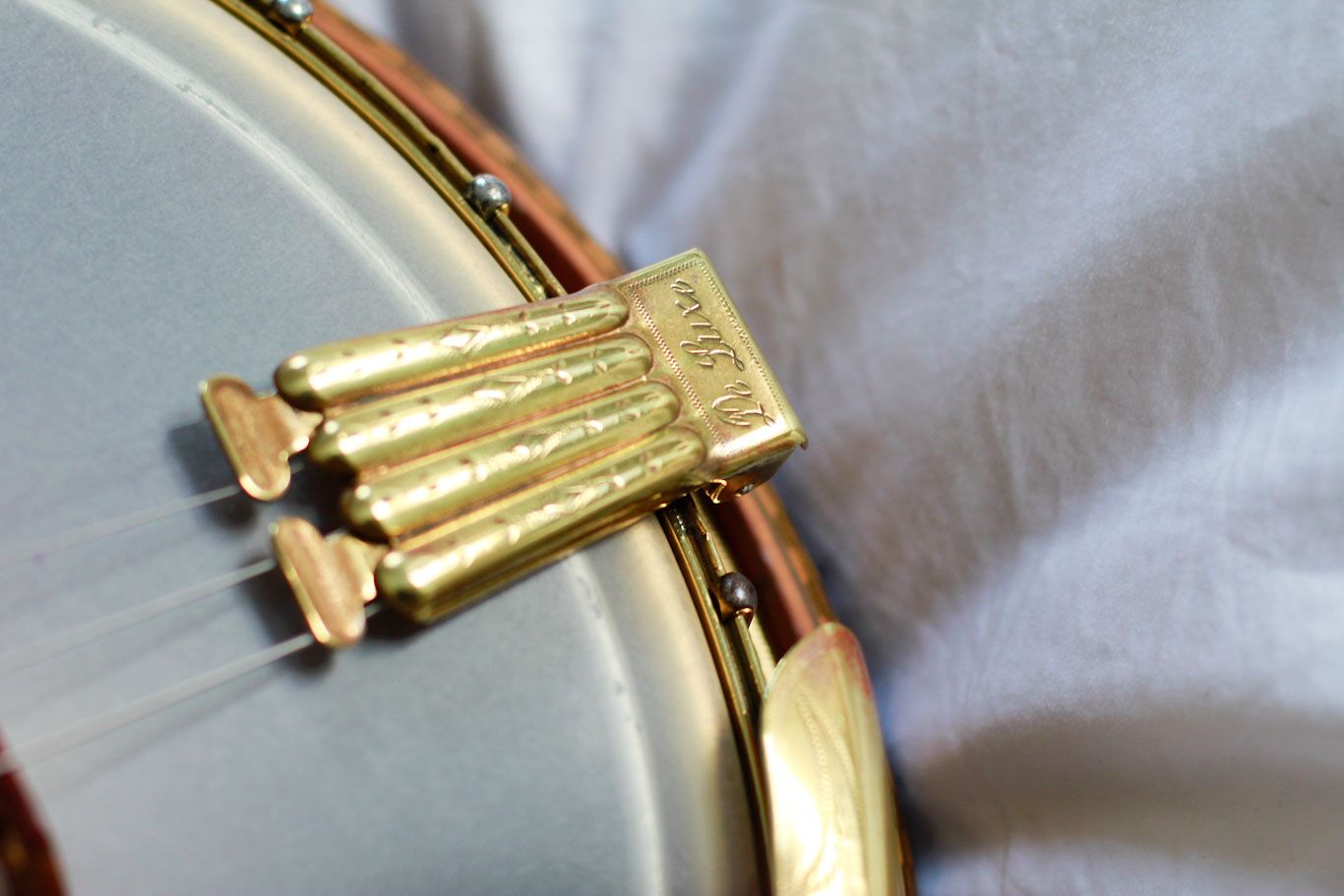 The banjo is in first class condition including the gold plated metal parts. As this is the top of the line ‘D’ model the tension hoop, skirt and flange are engraved. The arm rest is engraved as is the ‘Deluxe’ clamshell tail piece, the spring lever type which takes both loop and ball end strings, often found on the Epiphone Concert models.