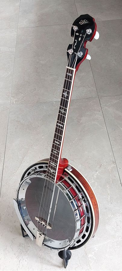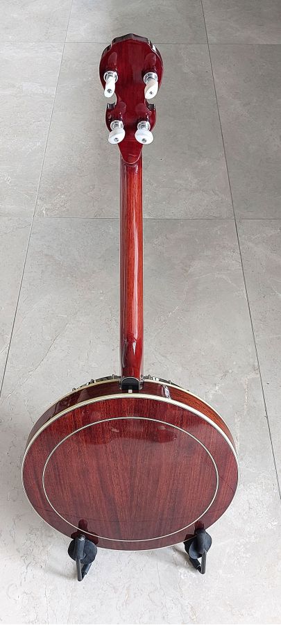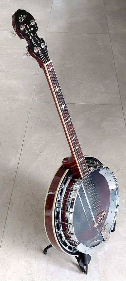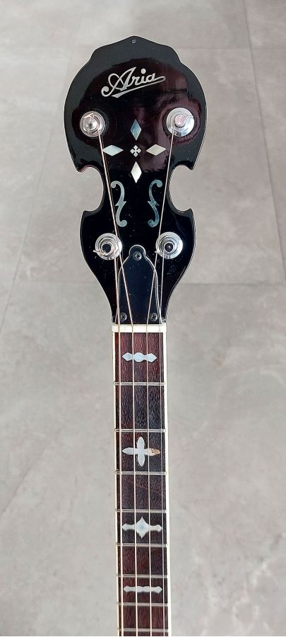 A beautiful Japanese made 19 fret tenor banjo in very good condition. These were a copy of the Gibson mastertone banjos and they do host quality parts including the flathead tone ring. Mahogany neck with bound ivoriod side binding and inlaid black position markers. Rosewood fretboard with Gibson style MOP and good frets with hardly any play wear. £30mm bone nut with, ebony head stock bearing Aria logo floral inlay and trust rod cover. Good straight neck with low action with the backup of the installed trust rod. Quality geared tuners with white pearl buttons and recently installed Clareen clear head and maple/ebony bridge with plastic inserts. Kershner tailpiece and gibson style armrest, tube and flange skirt and zinc flathead tone ring giving this banjo loud but sweet driving performance, believe me it is a lovely banjo to play. Mahogany resonator with matching white side bindings and concentric circle in the centre. As you’ll see from the photos this banjo is in A1 condition for an almost 50 year old instrument and has been well cared for. Recently set up with new strings and plays perfectly up the neck.