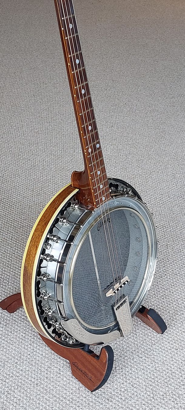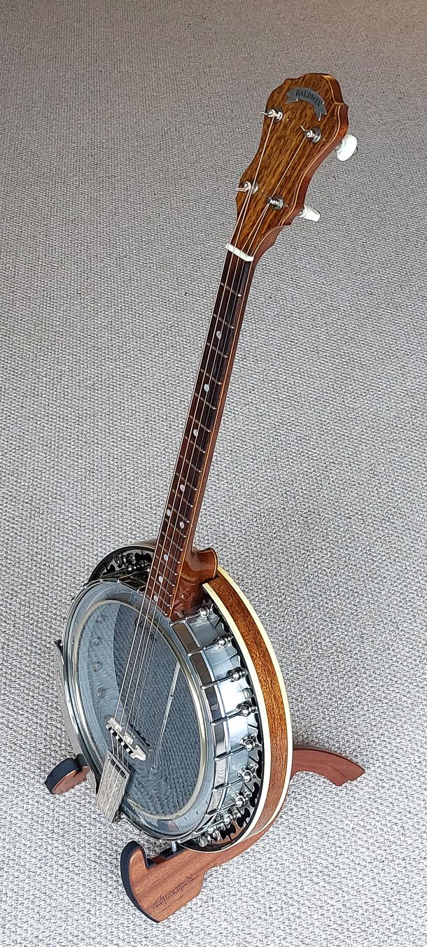Baldwin banjos have been designed by musicians who truly know and appreciate the instrument. Skilled craftsmen blend detailed hand work with modern techniques of construction. All parts are built to rigid specifications to insure consistent quality and to incorporate design refinements. For added strength and beauty the hand-crafted necks of mahogany or walnut are laminated with a centre strip of rose-wood between two thin layers of maple. Other marks of exceptional quality are the extra heavy brass tension hoop and resonator flange. This is the only ever built banjo with a 16:1 geared neck adjustment rod. Tonally the Baldwin is designed to provide the crisp resonance and lingering depths of the bright authentic banjo sound.