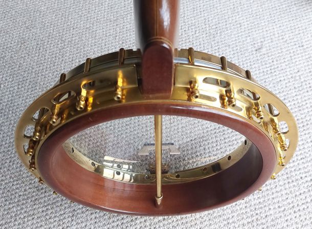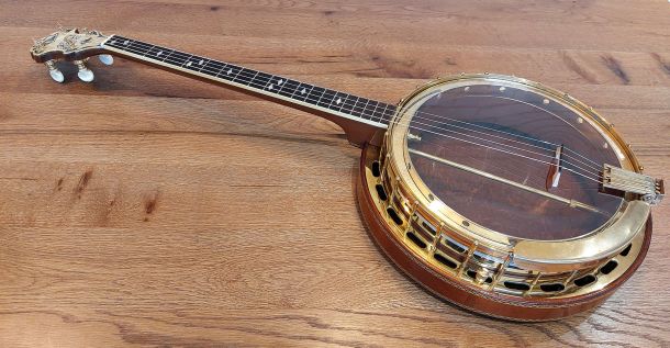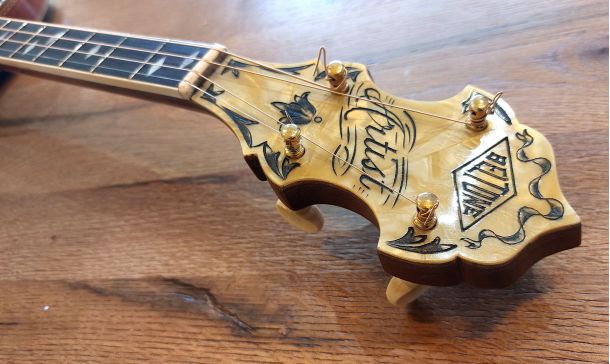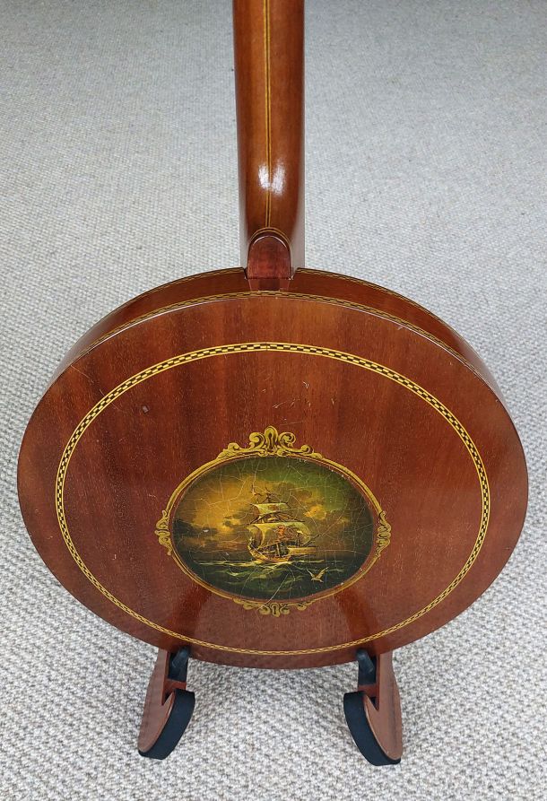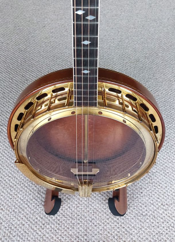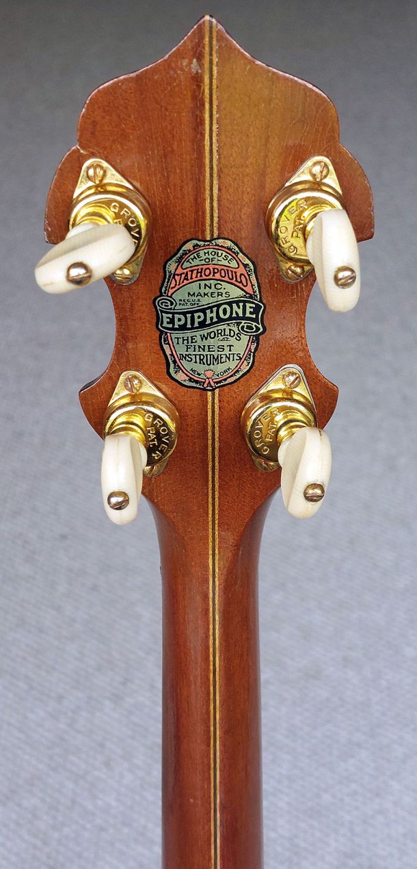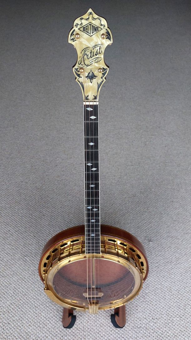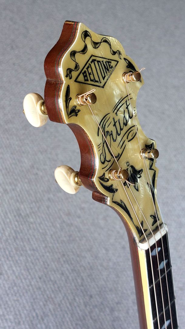 BELTONE ARTIST 19 fret tenor banjo built by the famous Epiphone Company approx 1930. This super nice quality banjo is in excellent condition and is all original. The Beltone is identical in build to the Epiphone Peerless model. The neck construction is from solid mahogany with a 3 centre laminate of maple, mahogany, maple for added strength. The rim is cut from a single piece and the mahogany resonator is spun from a single piece. Here lyes the 2 piece archtop tone ring which elevates the true sound of this Epiphone. Gorgeous details and quality materials are evident throughout the banjo. The headstock is faced with cream pyralin and the named Belton Artist etched in black filler. Ebony fret board with diamond shaped postion markers and white side binding. Original Grover Patent Tuners, Elton armrest, All Hardware Gold Plated is in fine condition with the most wear on the arm rest. Original Brown leatherette Case in excellent condition.