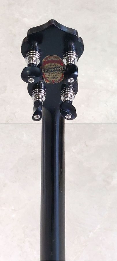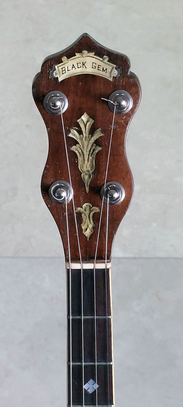 Epiphone Black Gem 19 fret tenor banjo, very rare and possibly the only one ever built! This could have been a prototype that was never launched into production. In 1925 Epiphone announced a new line of banjos consisting of White Beauty, Bluebud, Blackbird, and Golden Rod. Examples of the White Beauty and Golden Rod have been documented as well as Black Beauty. This banjo is built like the Black Beauty with the heavy 1st generation cast bronze archtop tone ring and heavy brass flange similar to the early Dragon Head Recording flanges.