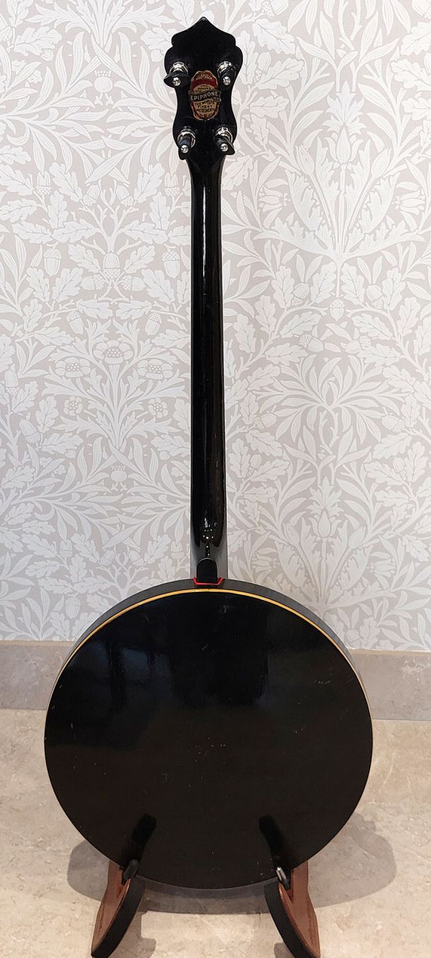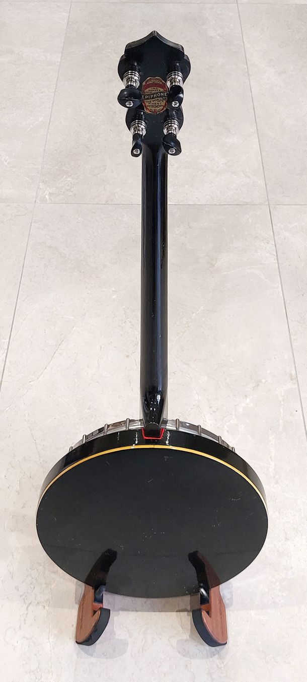 The banjo is in excellent condition and sounds as you would expect from a quality built Epiphone. The neck feels sleek and is very easy to play with nice low action. Nice pearl inlay in the headstock bearing the name Black Gem. The neck wood is possibly maple which has been stained black and clear lacquer finish as I would expect the same for the resonator. There is cream binding along the neck sides and resonator side walls. Ebony fret board with square MOP and good frets. Epiphone armrest and kershner tailpiece. New Remo “cloudy” head, new bridge and new set of nickel strings. Comes with original vintage case with green velour lining.
