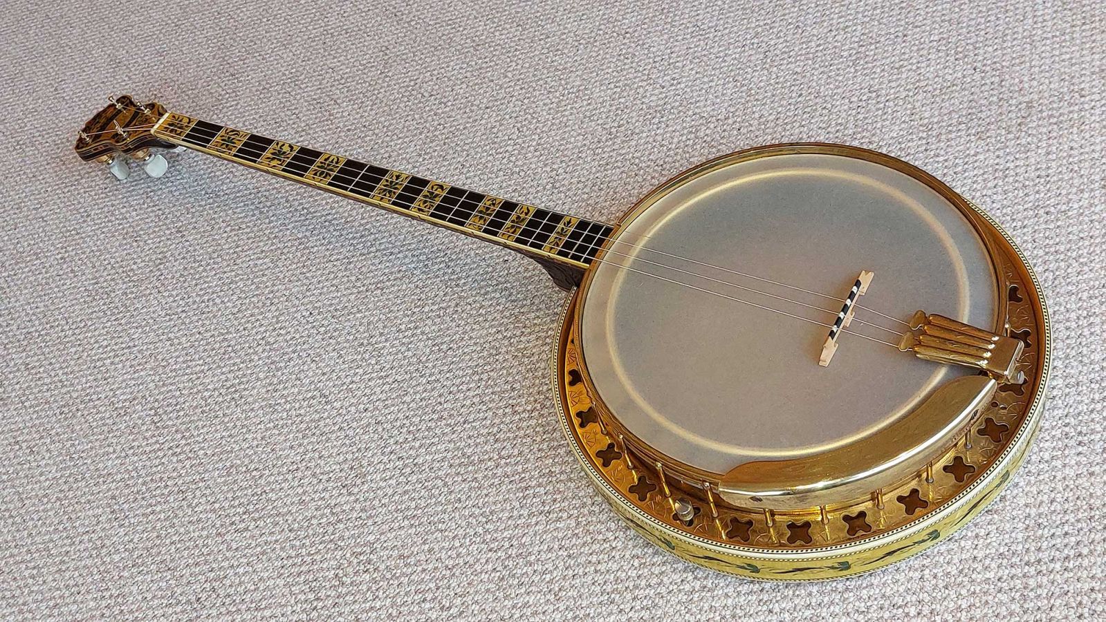 An exquisite, very beautiful 1930 Epiphone Concert 22 fret plectrum banjo. The preferred choice of many jazz players due to the longer scale length, but also played by Irish traditional players using a capo to shorten the longer stretch. All metal parts are gold-plated and engraved, including the deluxe Grover tuners resplendent with their genuine mother of pearl buttons. The instrument is in excellent original condition throughout including good frets and low action.
