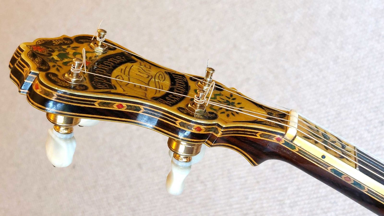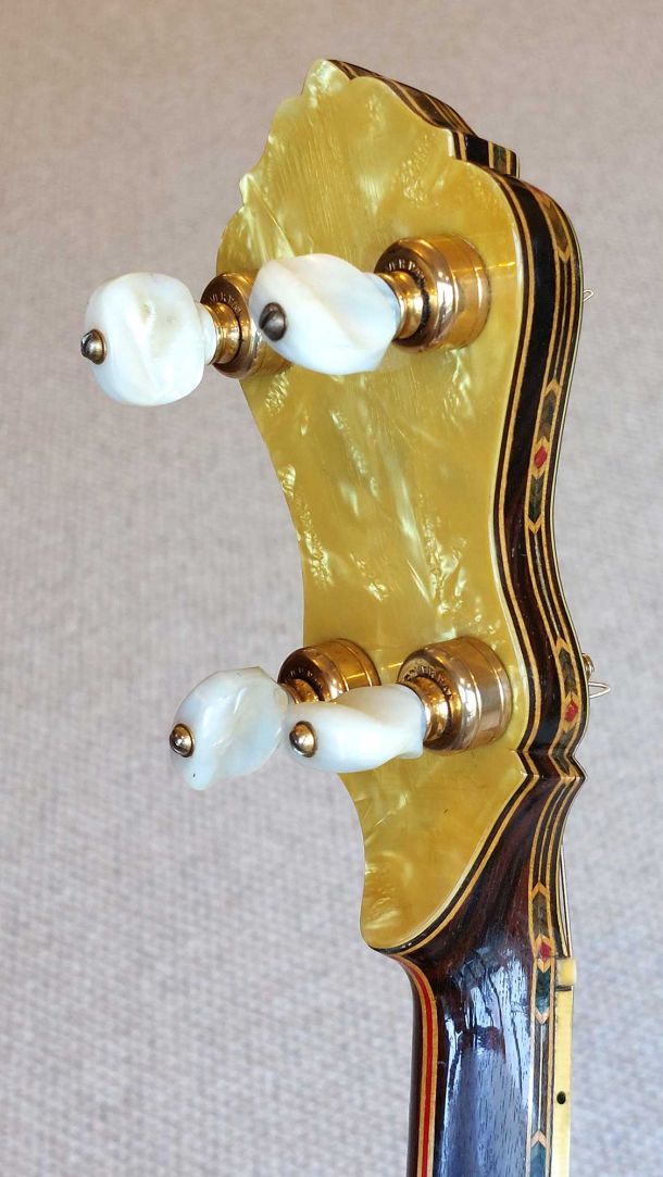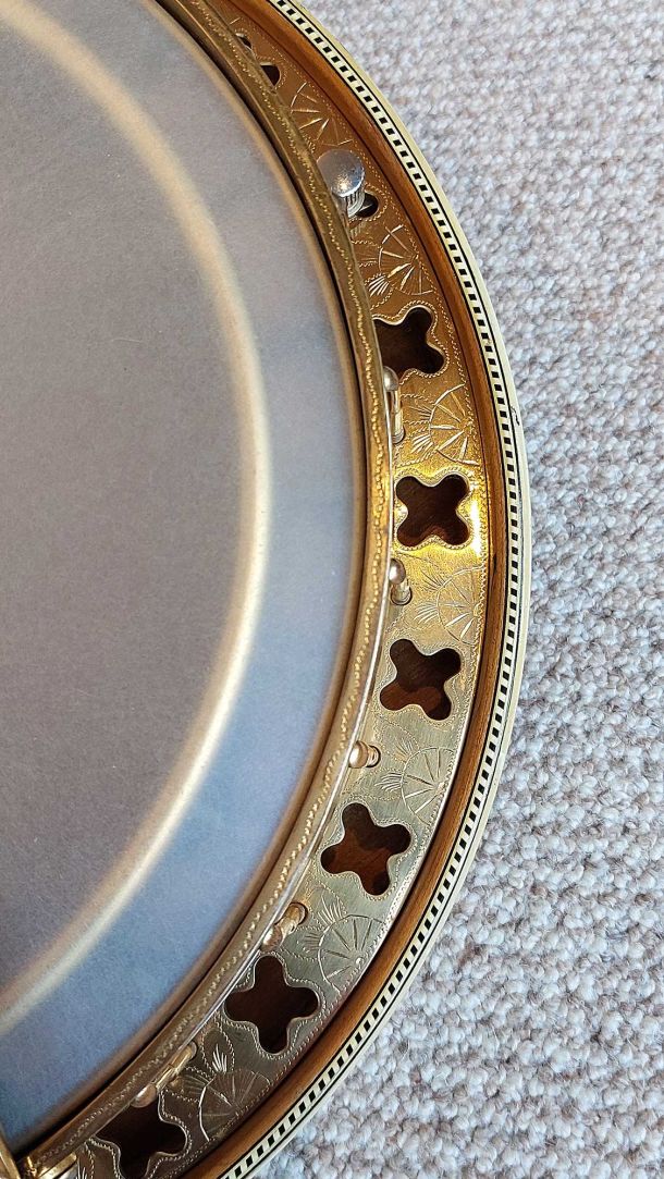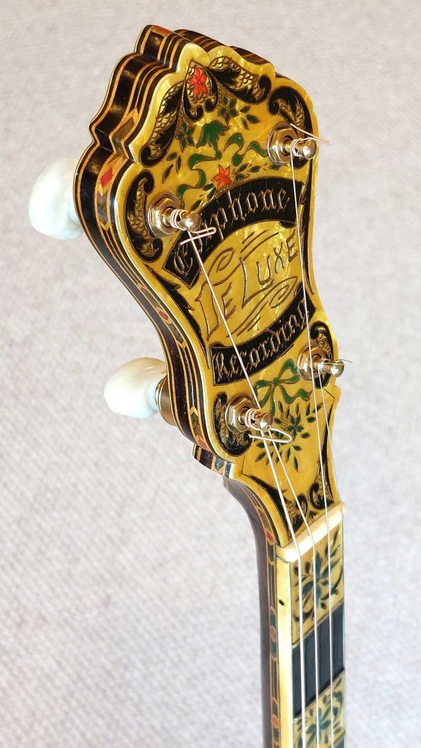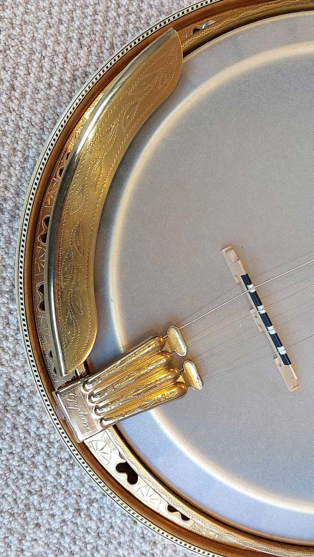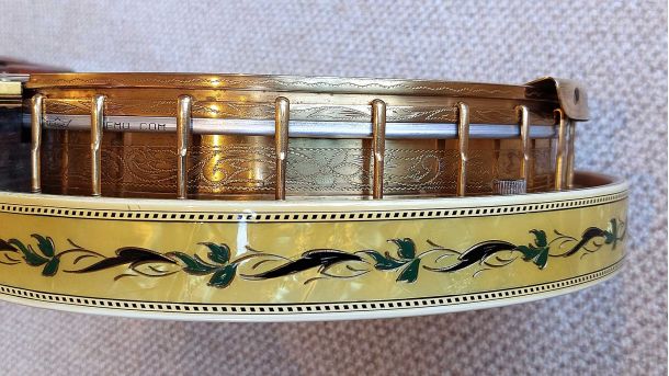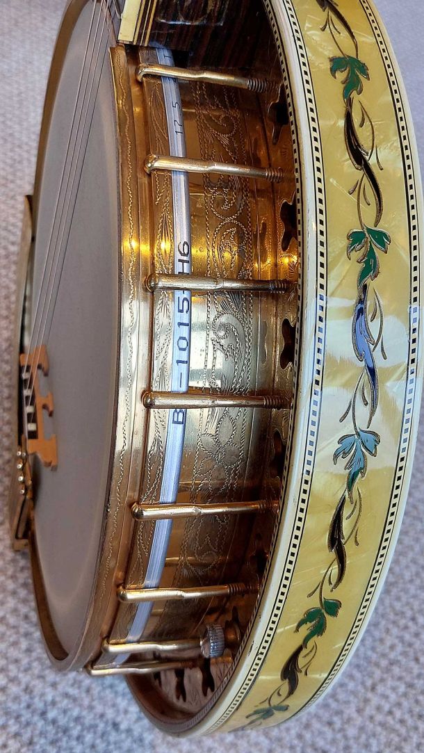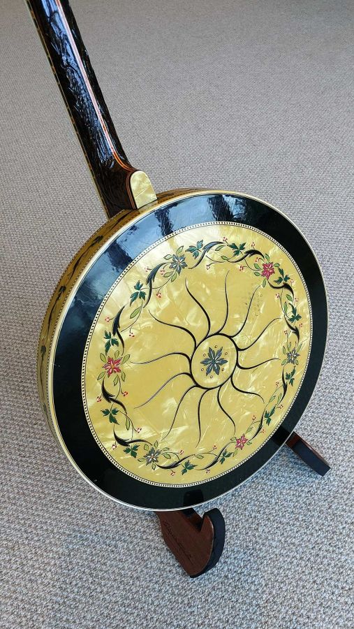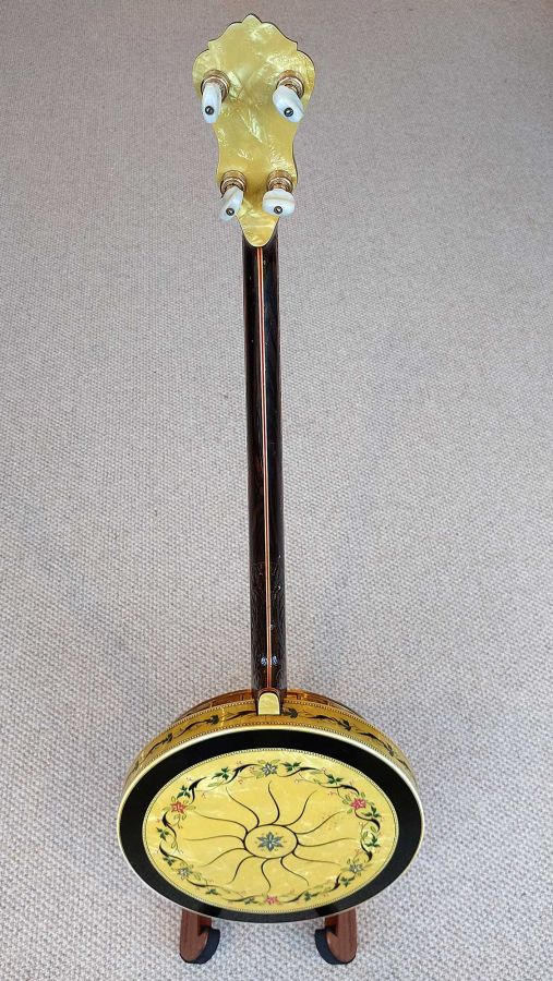 The resonator is equally spectacular, with its full covering in yellow/black pyralin and fancy engraved designs. The flange, tension hoop, tailpiece and side shirt are all engraved with excellent gold plating throughout. The banjo has been given a full valet and setup with a new renaissance head and phos bronze strings.