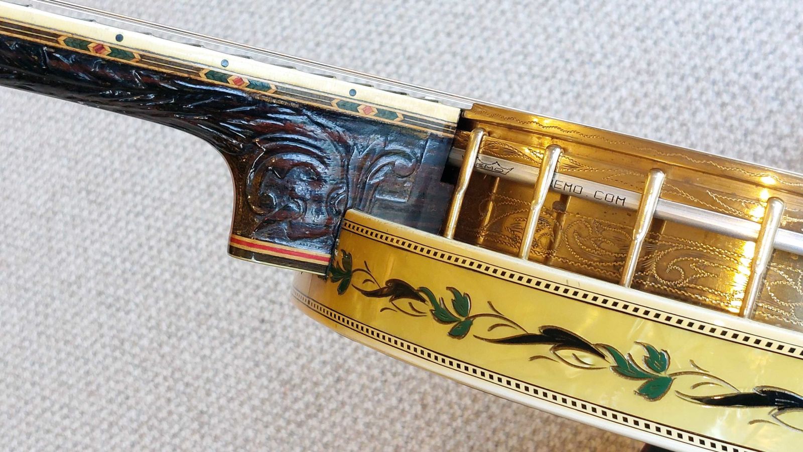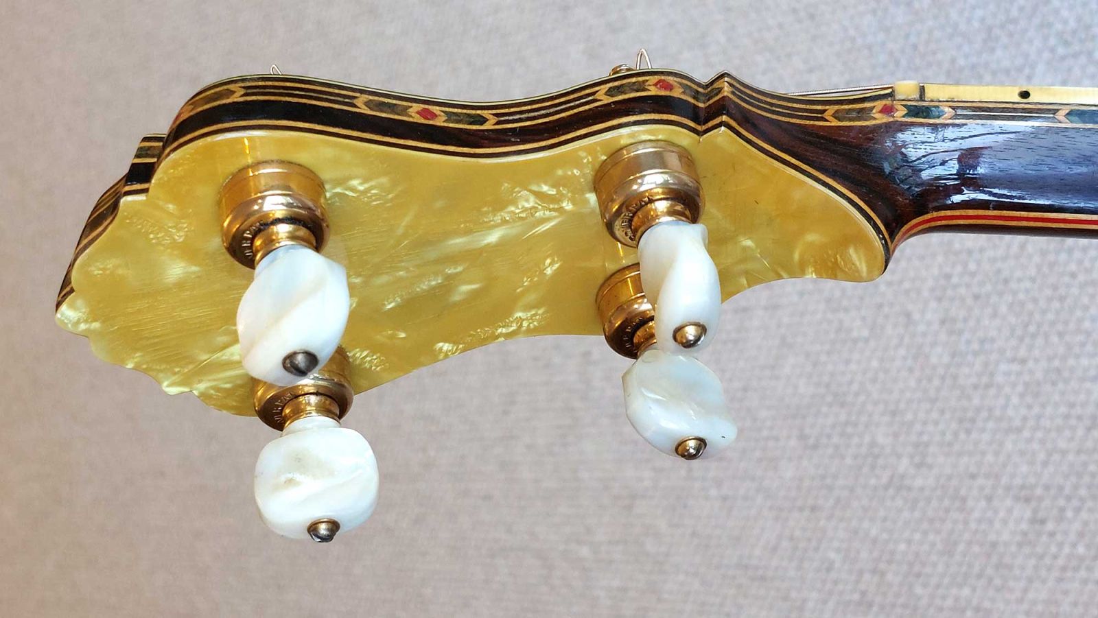 The five piece neck looks to be made from brazillian rosewood. The neck sides are decorated with ivoroid binding combined with a wood marquetry design, culminating in a gorgeous heel carving. The fret board is decorated with blocks of yellow and black pyralin with fancy engraved designs. The multi-laminated heel is finished with yellow pyralin.