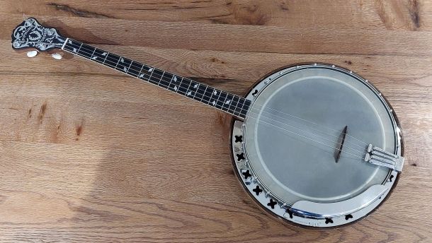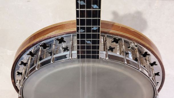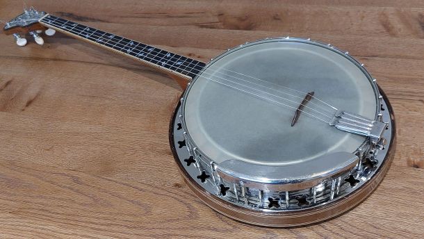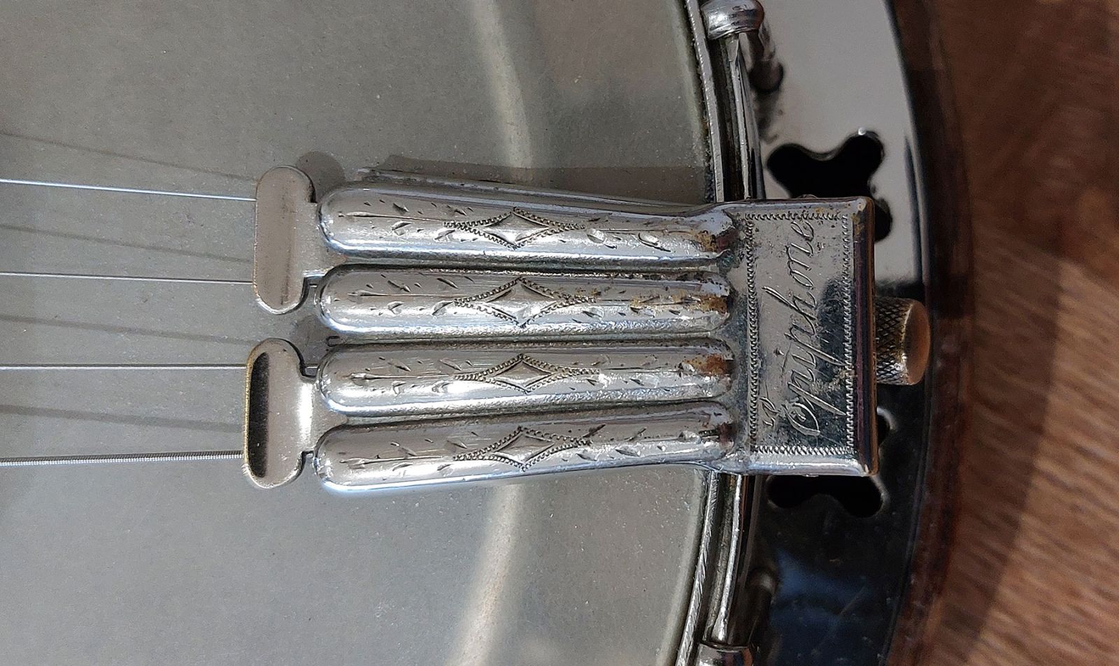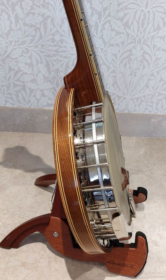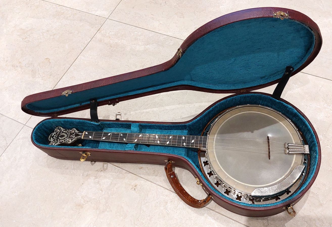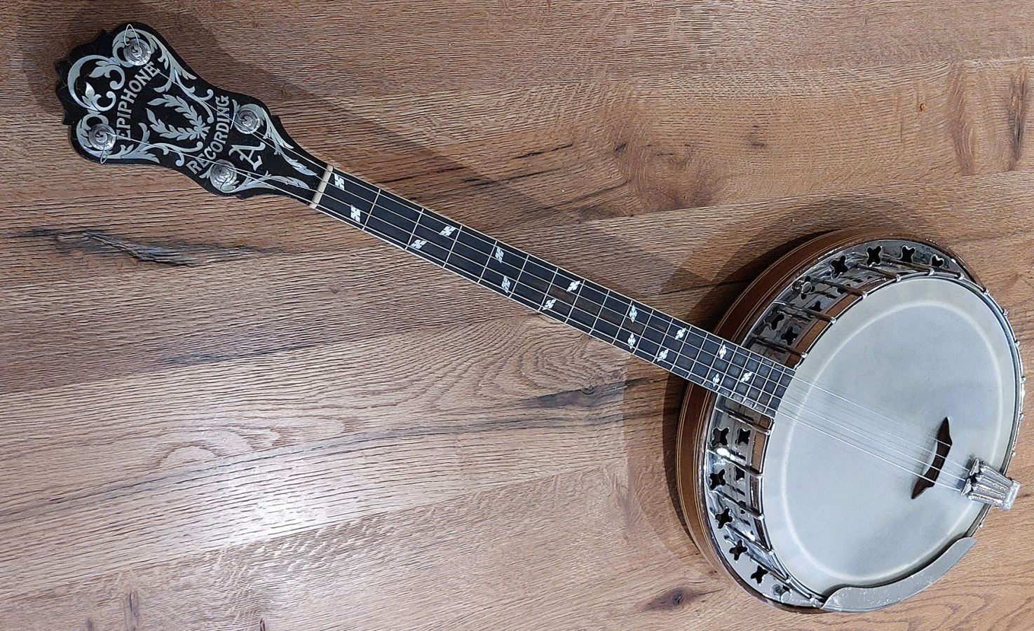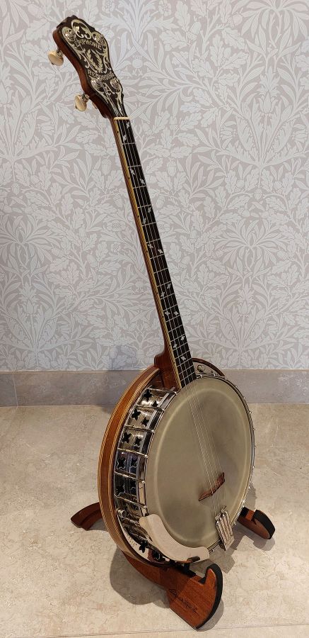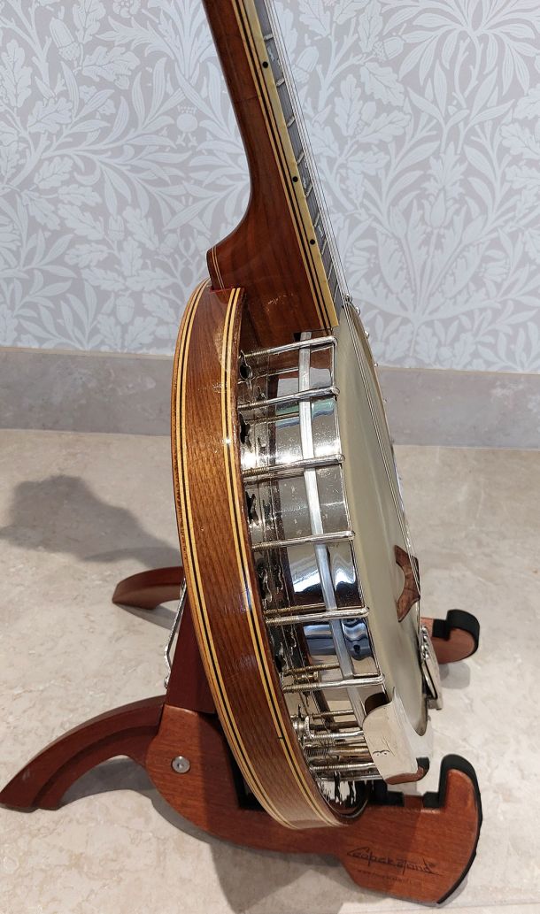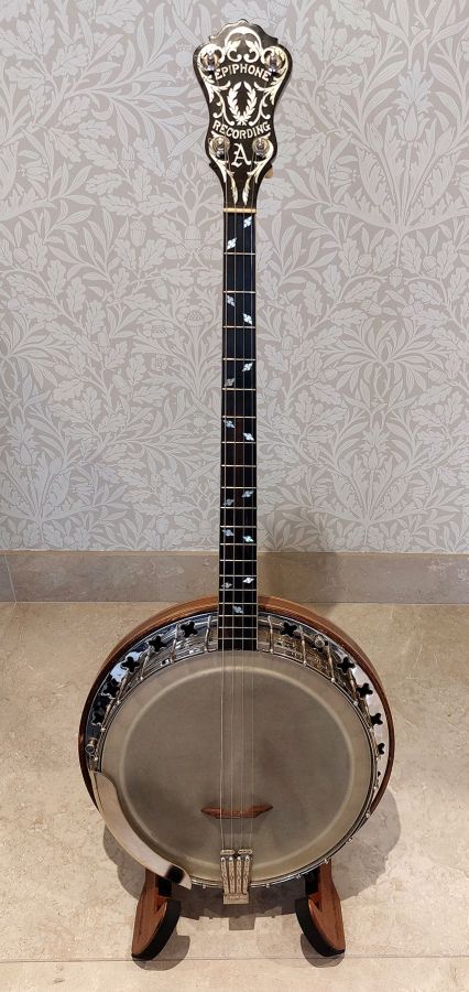 Epiphone Recording ‘A’ 19 fret tenor banjo. X style flange model bearing serial # 5915 featuring the 3rd generation tone ring where the tone ring rests upon 26 metal spacing segments that are embedded on the 3/4″ ply rim. American walnut neck is reinforced by three veneers of holly and ebony. The fingerboard is genuine Gaboon ebony, mounted on three veneers of contrasting woods, bound on the side with white pyralin. The neck is decorated with diamond style position markers and the head plate is ebony with an elaborate inlaid design of mother of pearl. The original Grover tuners were updated with quality Gotoh geared tuners which were professionally fitted by Clareen Banjos. Straight neck with low playing action right up the fret board. I have used nickel strings 12, 18w, 28w, and 38w gauge and is perfect for playing Irish trad. The sound of these banjos has to be heard to be believed, the tone is vibrant, powerful and far reaching, yet when played lightly moving the pick away from the bridge it has a low lilting sweetness and sonorous in quality. I have fitted one of my own hand made 5/8″ walnut and ebony tipped bridges.