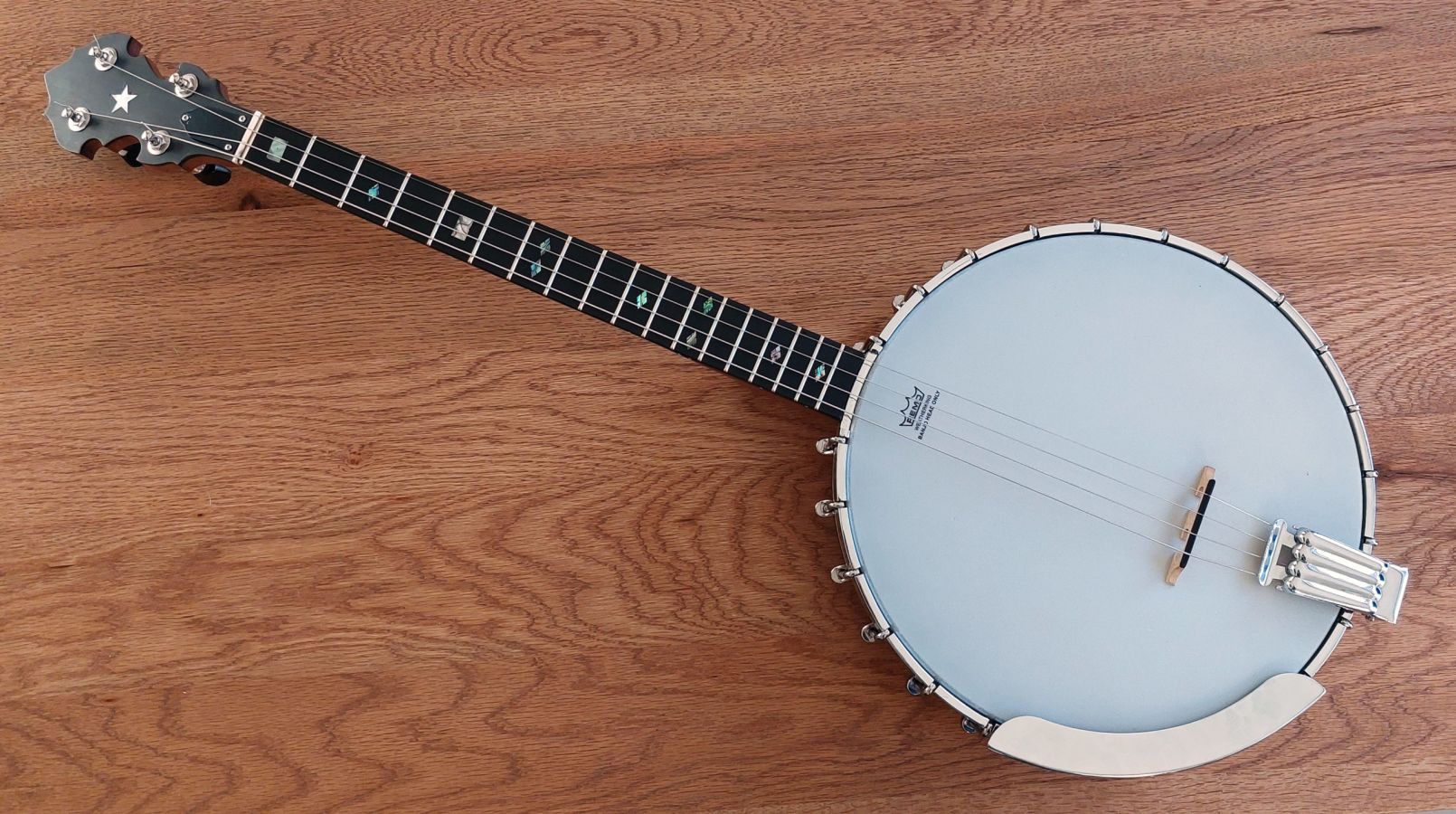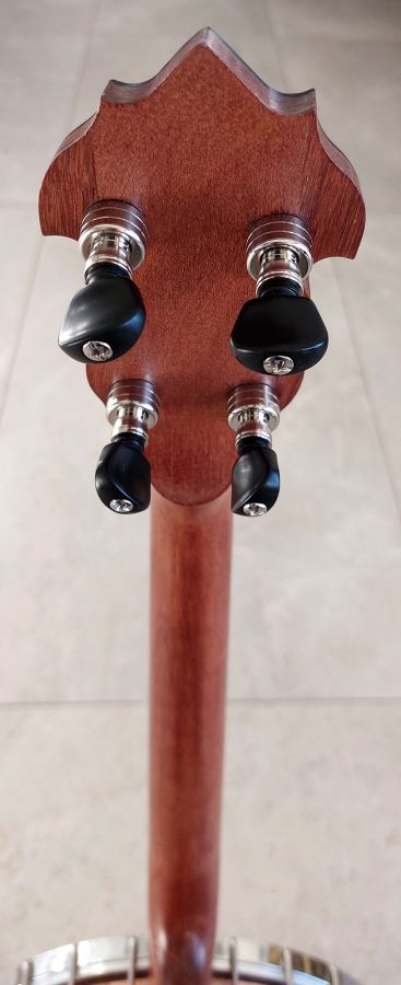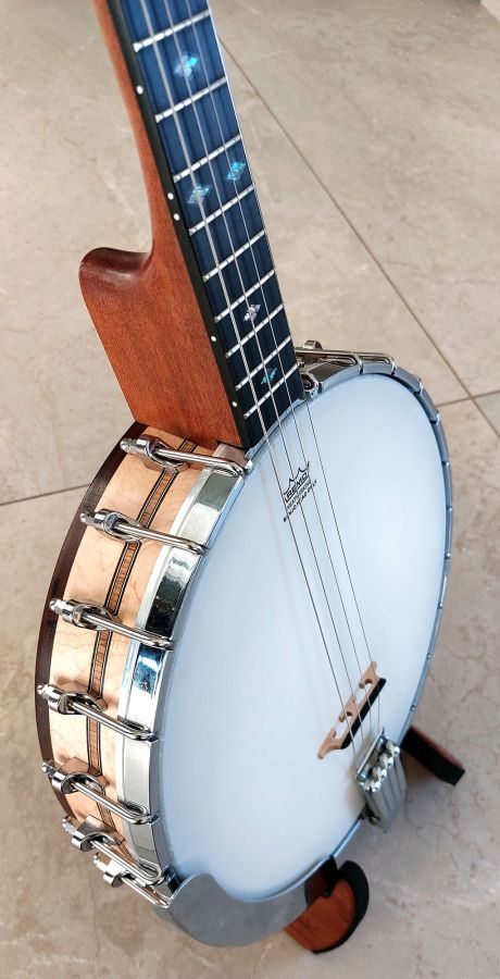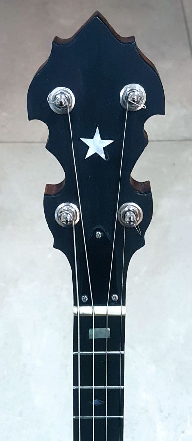 Recently hand built 17 fret short scale, open back tenor banjo by English luthier Thomas Jones from Bury. The neck is made from mahogany with ebony headstock overlay shaped in the familiar design known to Thomas Jones. Mother of pearl star inlay on headstock fitted with geared tuners with solid ebony buttons. Ebony fretboard with abalone diamond & rectangular position markers and side dots, 17 frets with zero fret at nut. 32mm Bone nut width but with thinner neck thickness profile and long heel butt. Very solid neck design fitted with truss rod and 22″ scale length.