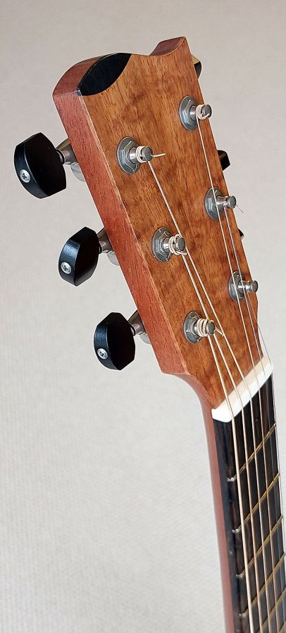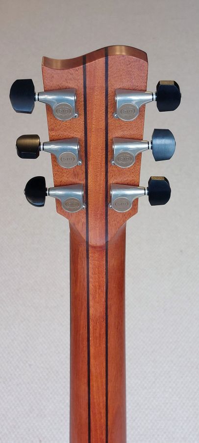 • Headstock: Faced with Tasmanian Blackwood, showing a beautiful figuring and a slightly curved top edge, complementing the guitar’s boutique aesthetic.
