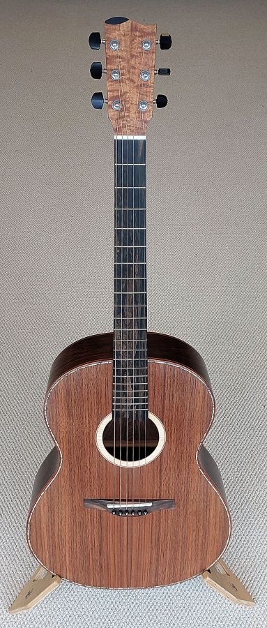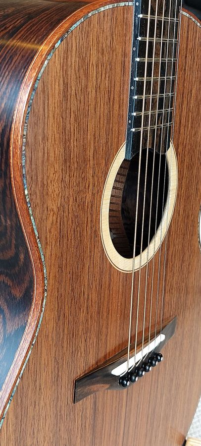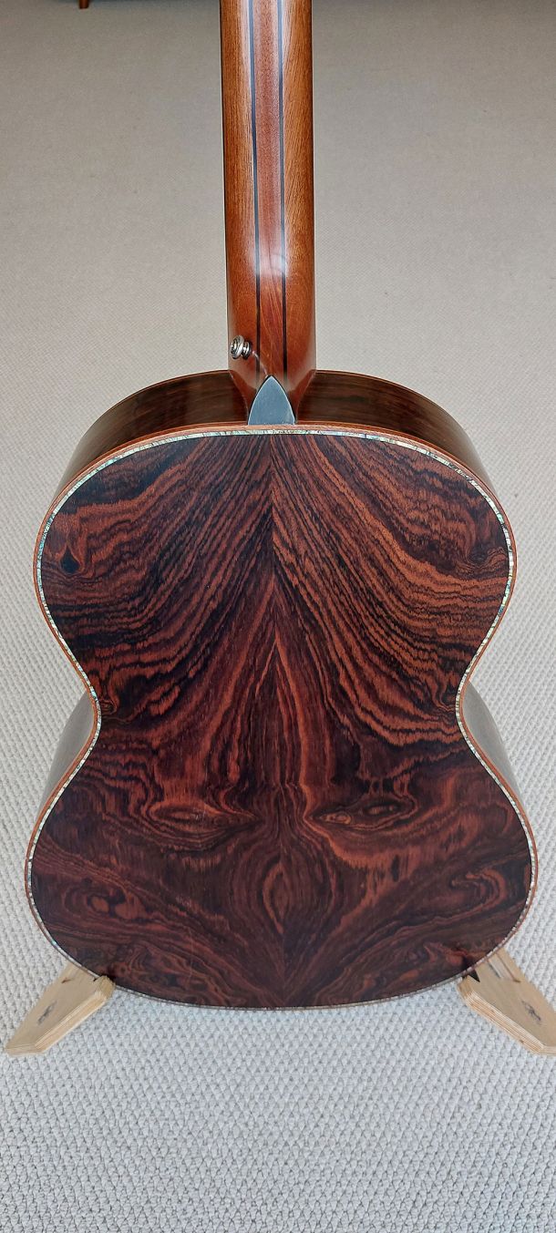 This guitar is a high-end, handcrafted acoustic made by Stephen McClenaghan from Hawthorne Lutherie, Belfast. With its figured and exotic tonewoods, high-spec hardware (like Gotoh 510 tuners), and thoughtful appointments like abalone purfling and mother-of-pearl inlays, it’s clearly designed for both beauty and tonal excellence. It would be well-suited for a professional fingerstyle player or anyone who appreciates fine luthiery. The attention to detail is phenomenal and the sound and playability has to be experienced.