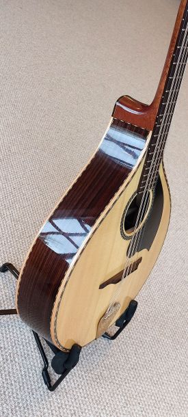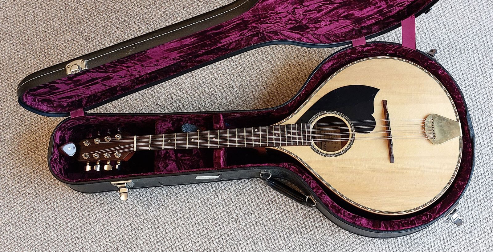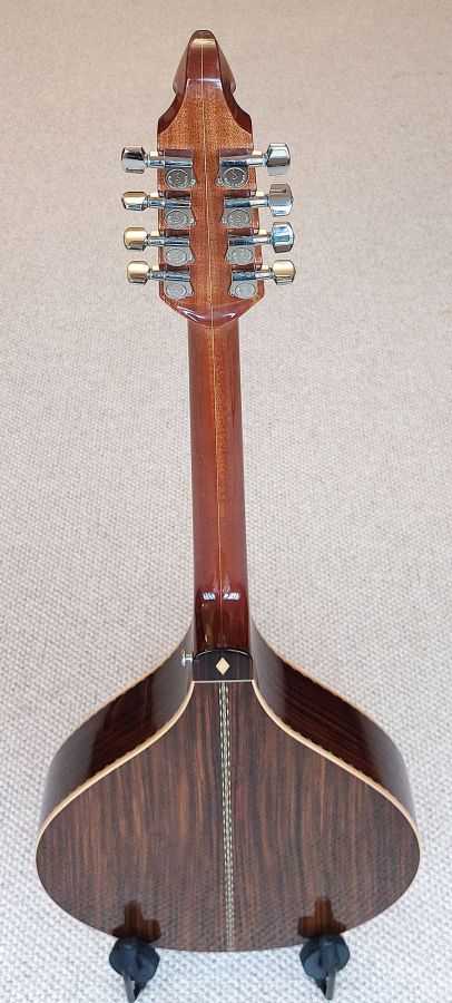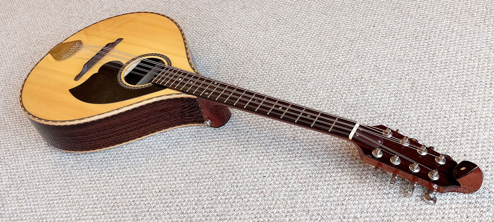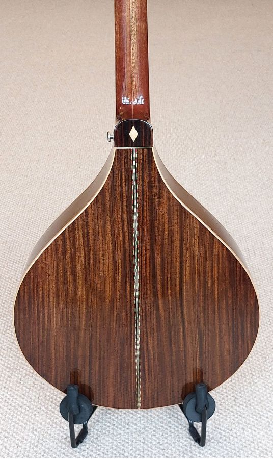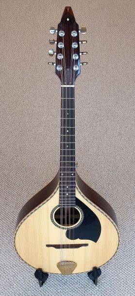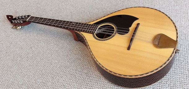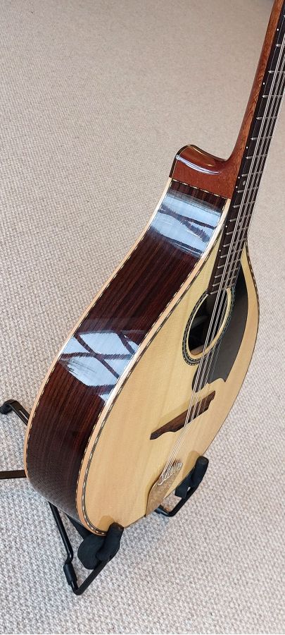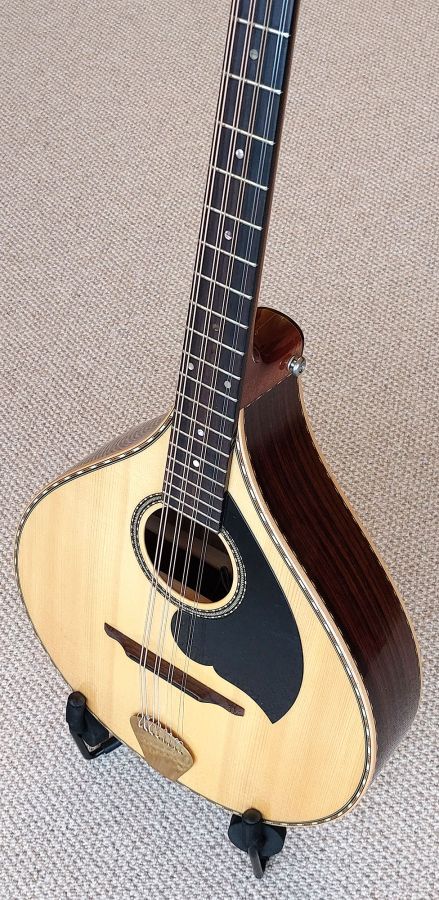A beautiful sounding work of art from renowned Irish Luthier Joe Foley of Dublin made in 2014. Tight grained Alpine spruce top and 2 piece Indian rosewood back & sides with rope seam (see pics). Bound top and bottom in maple with rope purfling on the top, with a black/white/black – mahogany – black/white /black rosette around the sound hole. 3 piece mahogany/maple/mahogany neck/peghead with distinctive ‘triangle and diamond’ crown. This octave mandolin has a 21 inch scale, nut width 1 3/8”. Nice low action, this octave is loud, and amazingly resonant, deep lows and bell like highs.
