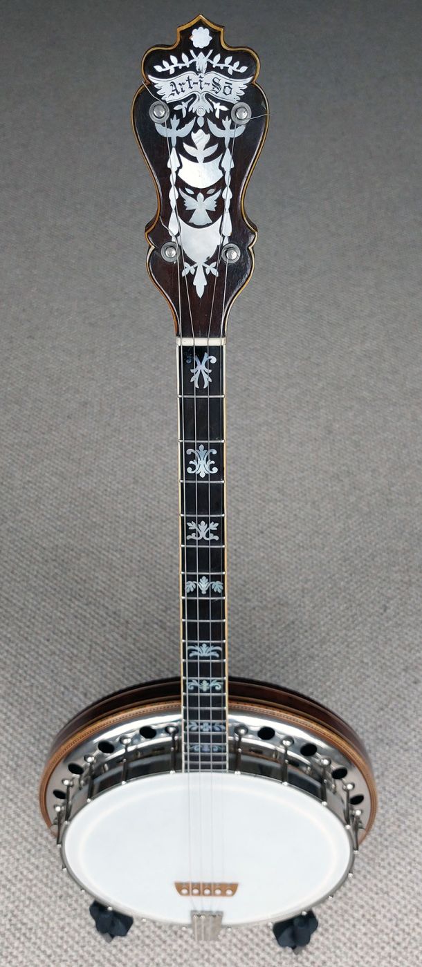 Beautiful 19 fret tenor banjo from 1920’s made by the Puntolillo Company, New York. Same company responsible for building the S. S. Stewart branded banjos like the Wondertone. Great sounding arch top banjo which has a sweet sustain with bass resonance and a rich soft tone, lovely low action and a dream to play. The neck is made from Brazillian rosewood laminated with maple and pearwood to form a 7 piece reinforced neck. Ebony fretboard with floral MOP position markers and nicely inlaid mother of pearl to the head stock bearing the name ‘Art-i-So’ which is one of the Majestic range of hand built banjos.