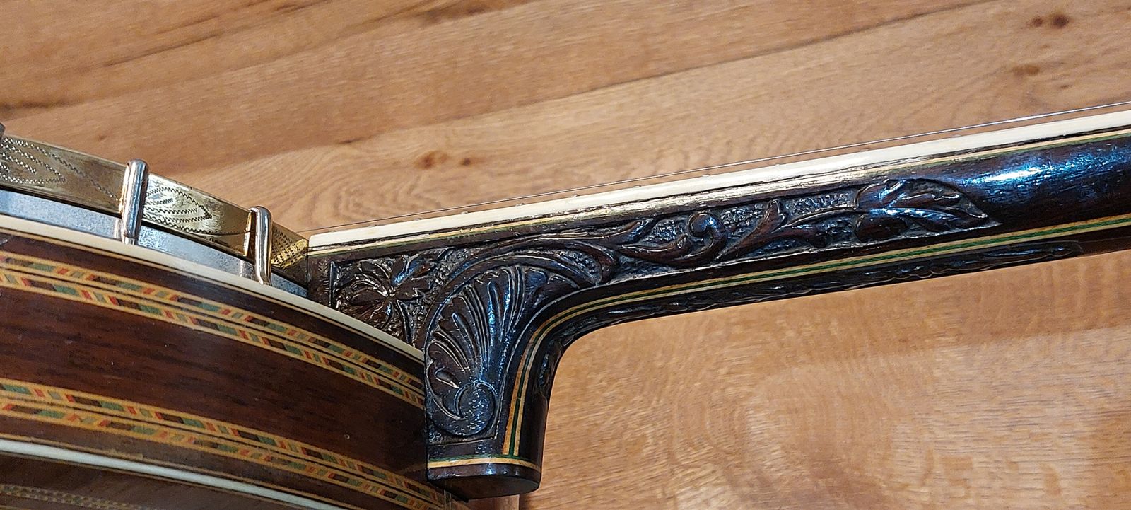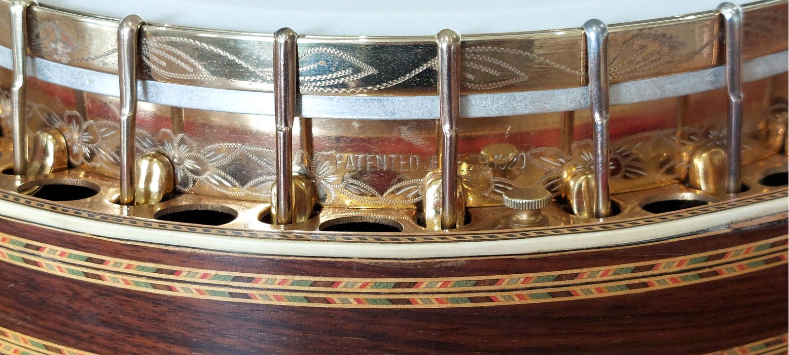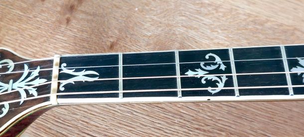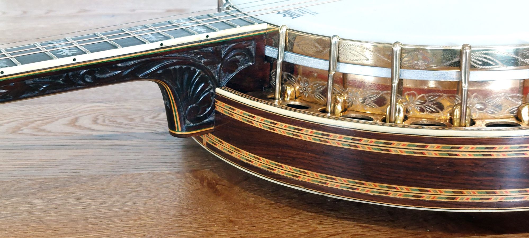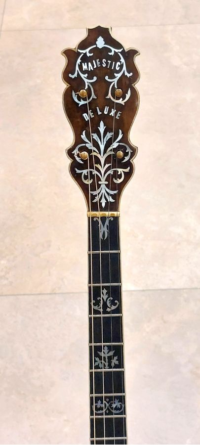 Starting in the engine area that drives the sound from this magnificent banjo is a flat bar archtop tone ring with side holes seated on metal grommets. It is in beautiful, original condition for an early 1920’s vintage instrument which has been very well cared for over the decades. The nine piece neck is constructed from select Brazillan rosewood with multi-layered pear wood and maple centre, with cream binding and triple wood laminate along the rosewood fretboard, which is perfectly straight with nice low playing action. This model also features the beautifully carved heel. The position markers have nice floral shaped mother of pearl inlays and a complete re-fret has been done by myself. The head stock is very tastefully decorated in beautiful mother of pearl floral inlay bearing the name Majestic Deluxe. The side walls of the stock head is horizontally multi-laminated in ebony, maple highlighted with a nice white binding edge. The original tuners (same type used on Epiphone banjos) are in perfect working condition and hold tuning well. The rim construction is 3/4 inch thick maple multiply laminate with outer rosewood veneer, housing the 24 shoes, hooks & nuts. The neck is attached to the rim by a centre steel bar and 1/2″ outer circular sleeve.