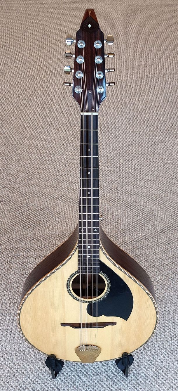 Built at Rosta Capek’s shop in Prague, Czech Replublic in 2008 serial #366 . Beautifully finished in sunburst effect, the lacquer is in excellent condition and has been very well cared for by its previous owner. You’ll have a long wait if you ordered a mandolin from Costa, possibly 2-3 years as his mandolins are in great demand nowadays. This professional quality A4 model basic model (A style, oval soundhole). Solid spruce top, solid flamed maple back and sides, ebony (flat) fretboard and bridge, 28 mm nut width, abalone inlaid logo and bound soundhole. It has volume and depth, sweetness and clarity. Comes with Fishman removable bridge pickup and I’ll include the original adjustable bridge which came with the mandolin. These models retail at 2250 euros