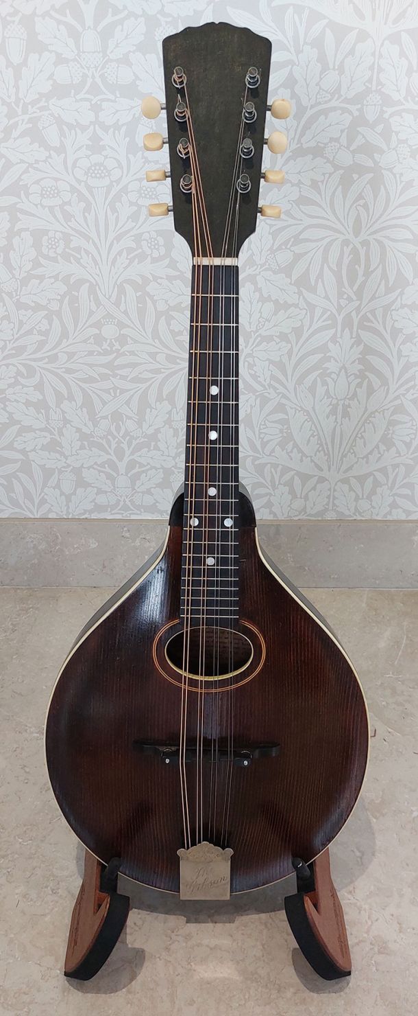 A beautifully cherished 1918 Gibson Style A mandolin in very good condition. Mahogany neck, Sheraton brown stained spruce top, carved, oval sound hole top is Red Spruce, the sides are Maple as is the carved back. The fingerboard and bridge are Ebony.. Original Gibson Tail piece, adjustable bridge, straight neck, good frets with low action, just fitted with new bronze phospher strings. Its very easy to play and has a sparkling clear tone that these mandolins are known for. Fitted with new vintage style waverly tuners but comes with the originals. The pick guard is long gone but these are available through the likes of ebay etc. I’ve owned this little mandolin for years but it’s time someone else enjoyed playing it. Comes with hardshell mandolin case with black fur lining.