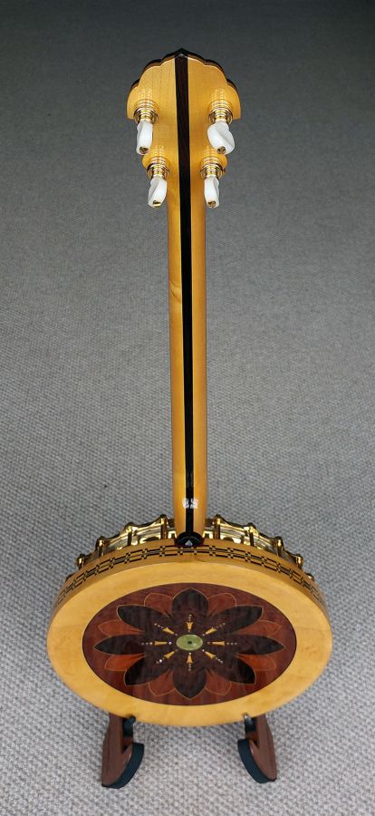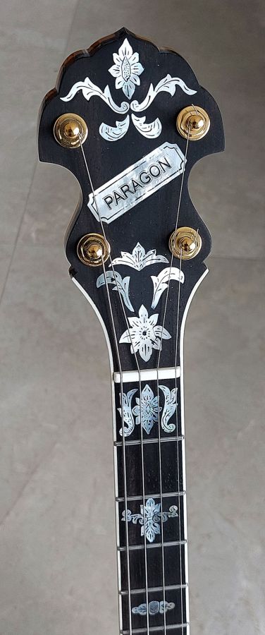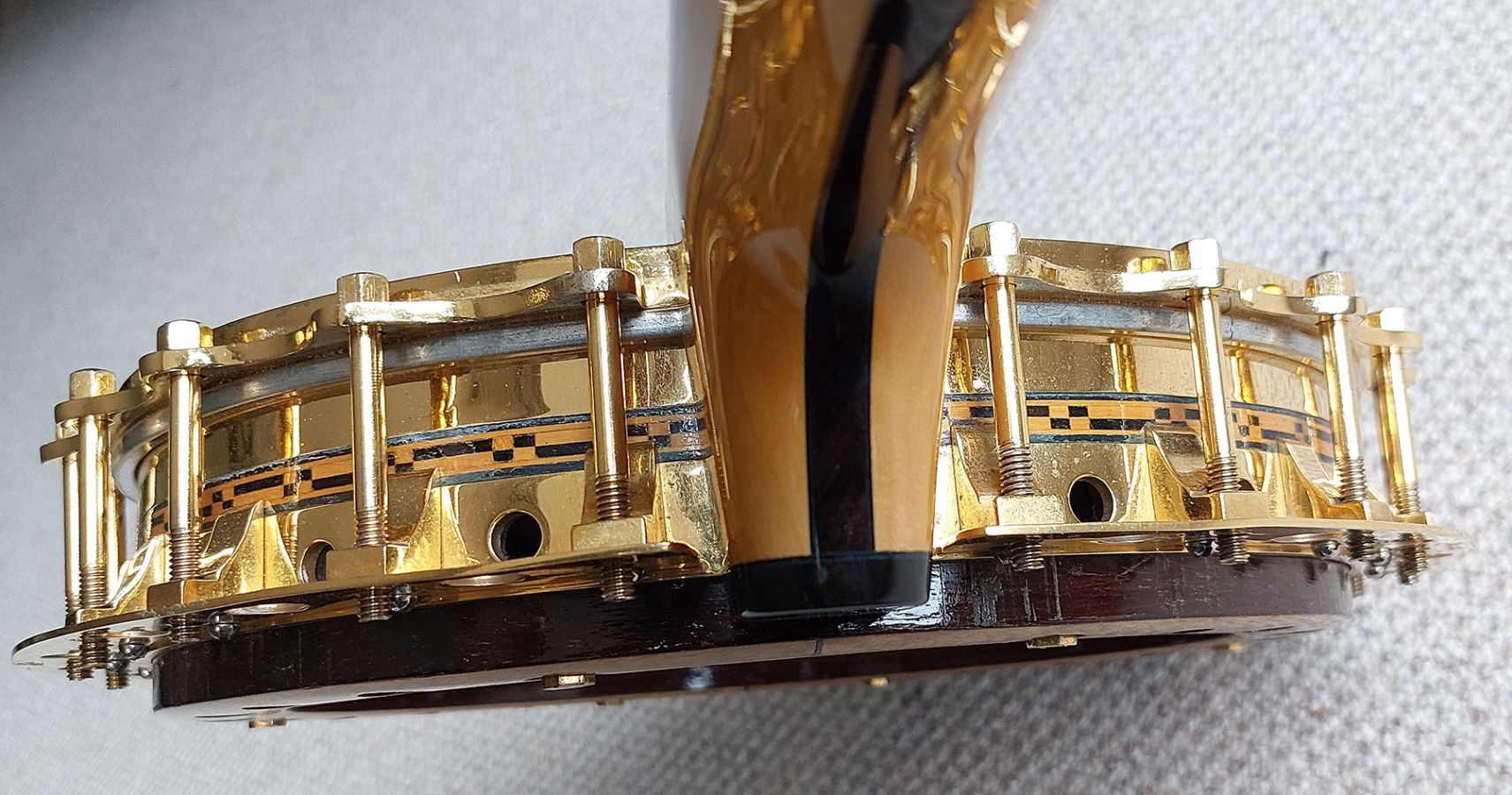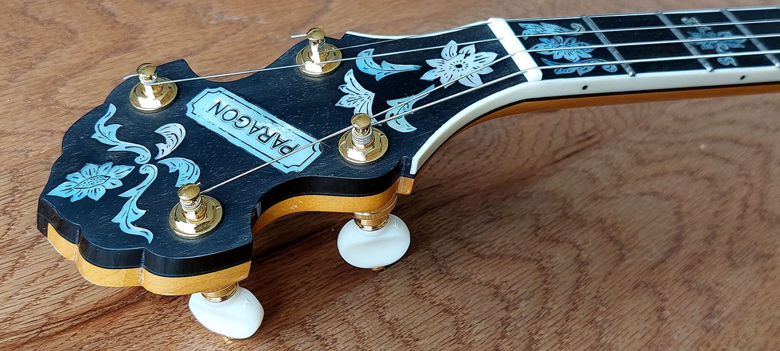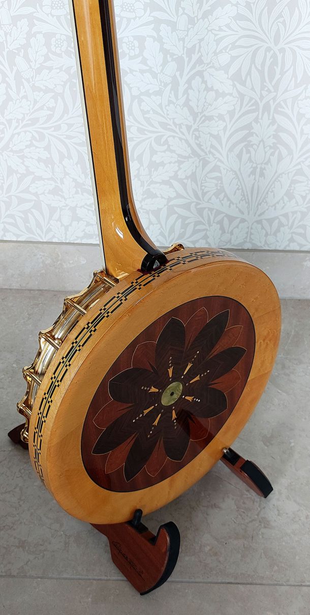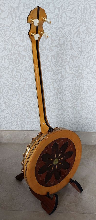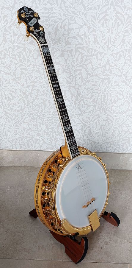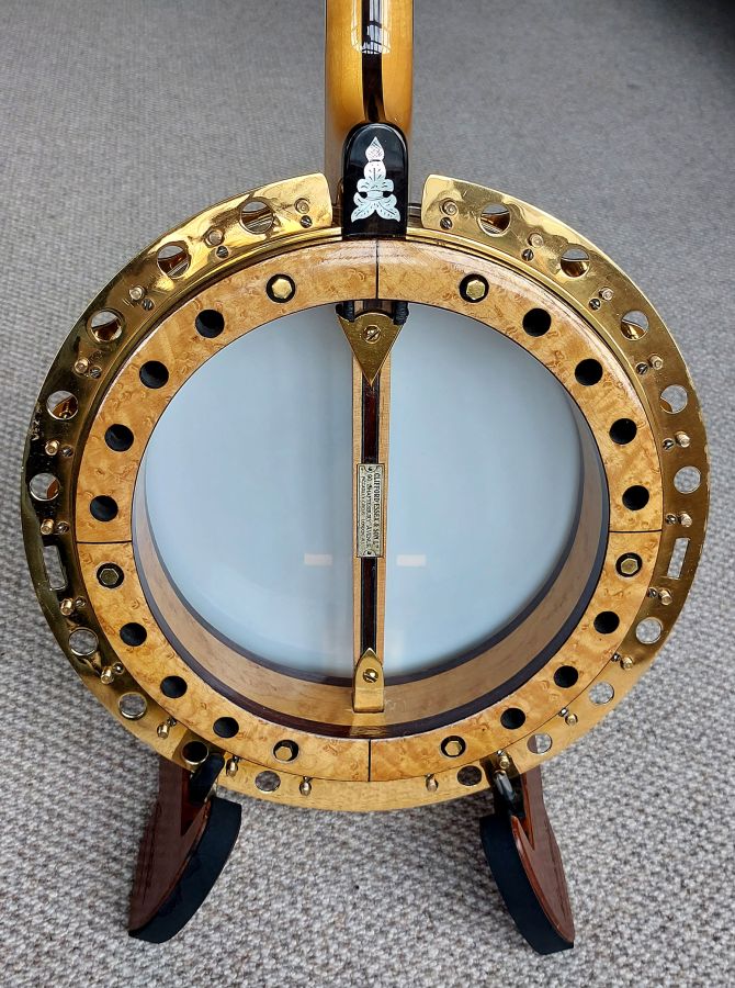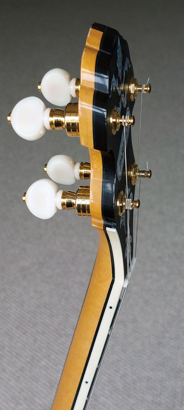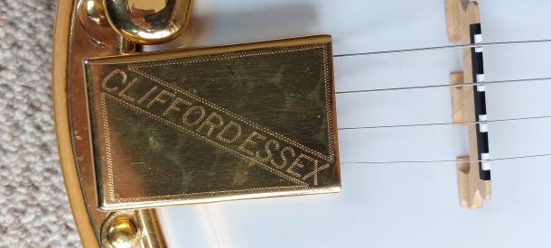 Clifford Essex top tension 19 fret tenor banjo, which started its life as a plectrum banjo and was professionally converted to a tenor by the renowned luthier Robert Aylward. This may have been a special commission as I haven’t seen this model in gold plating before. The top tension Paragon sound different to the CE models, the sound projection from the tone chamber excels power and pure tone. When you want volume, you got it, when you want sustain, you got it. As with the Epiphone range of tenor banjos, Clifford Essex Paragon stand side by side in the ranking of ‘want to own’ top tenor banjos.