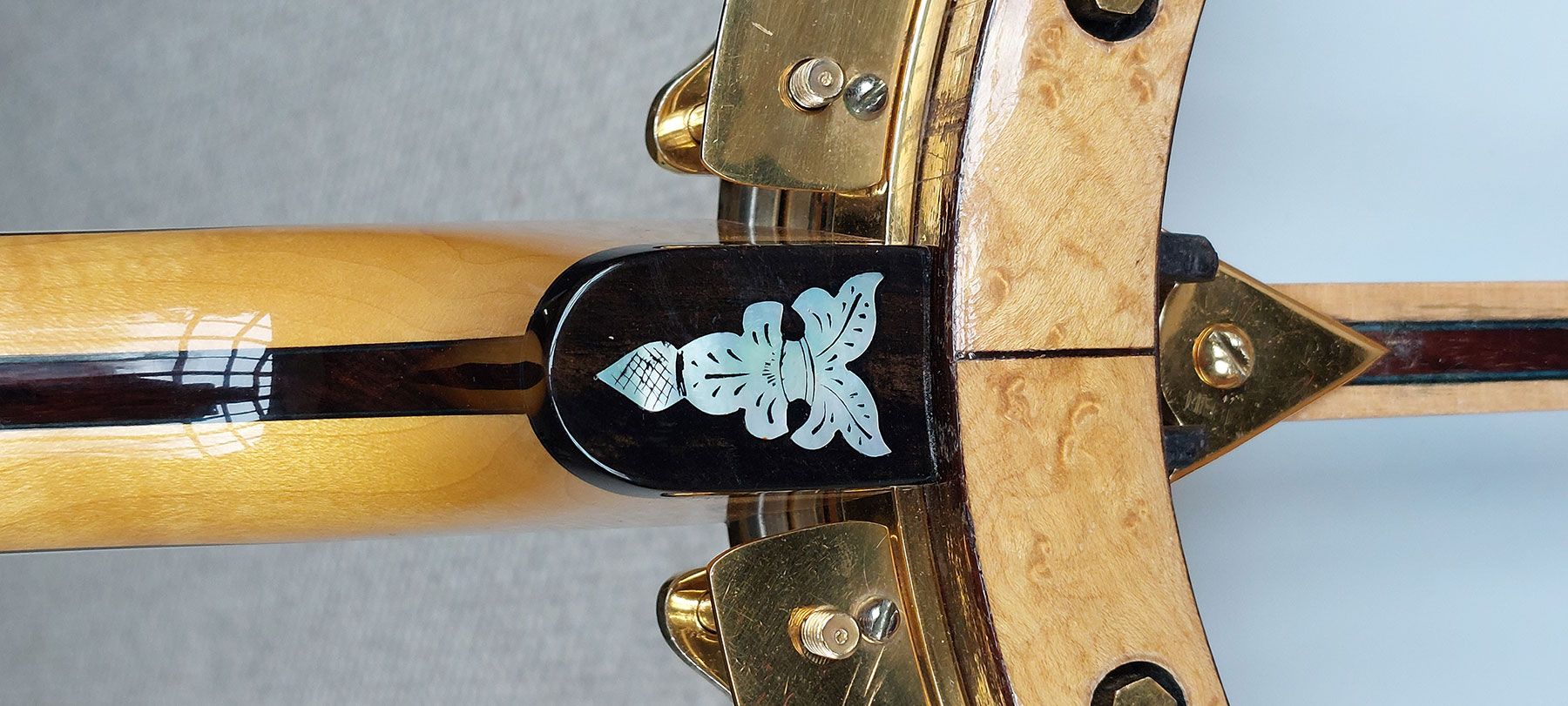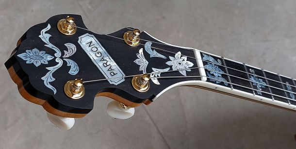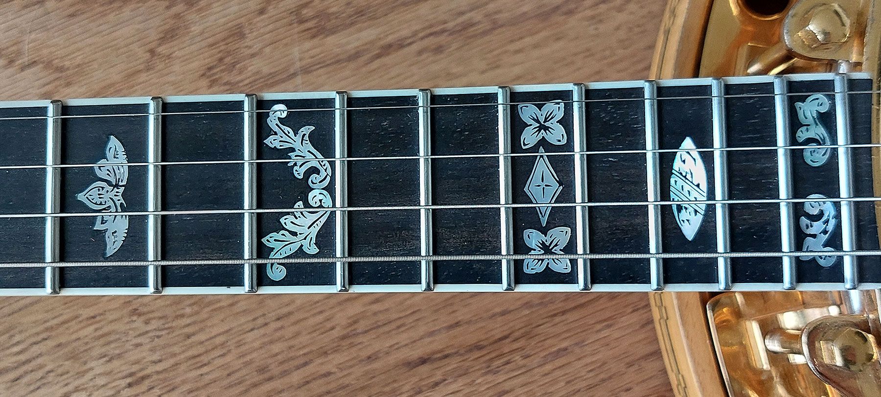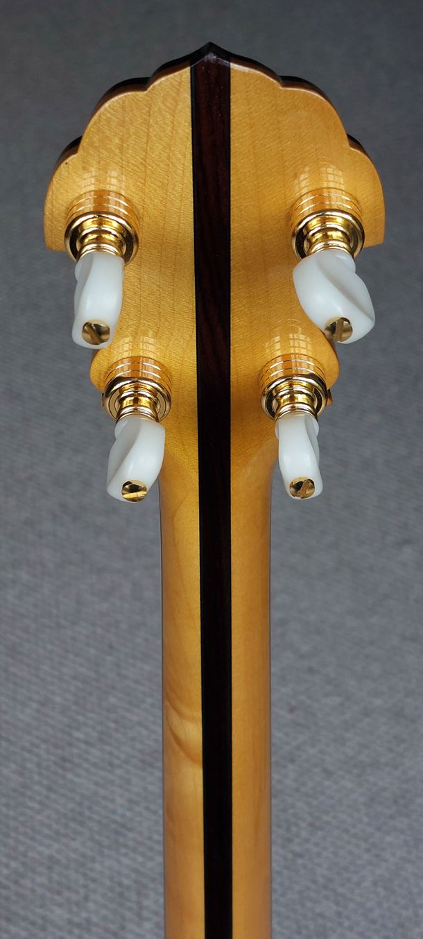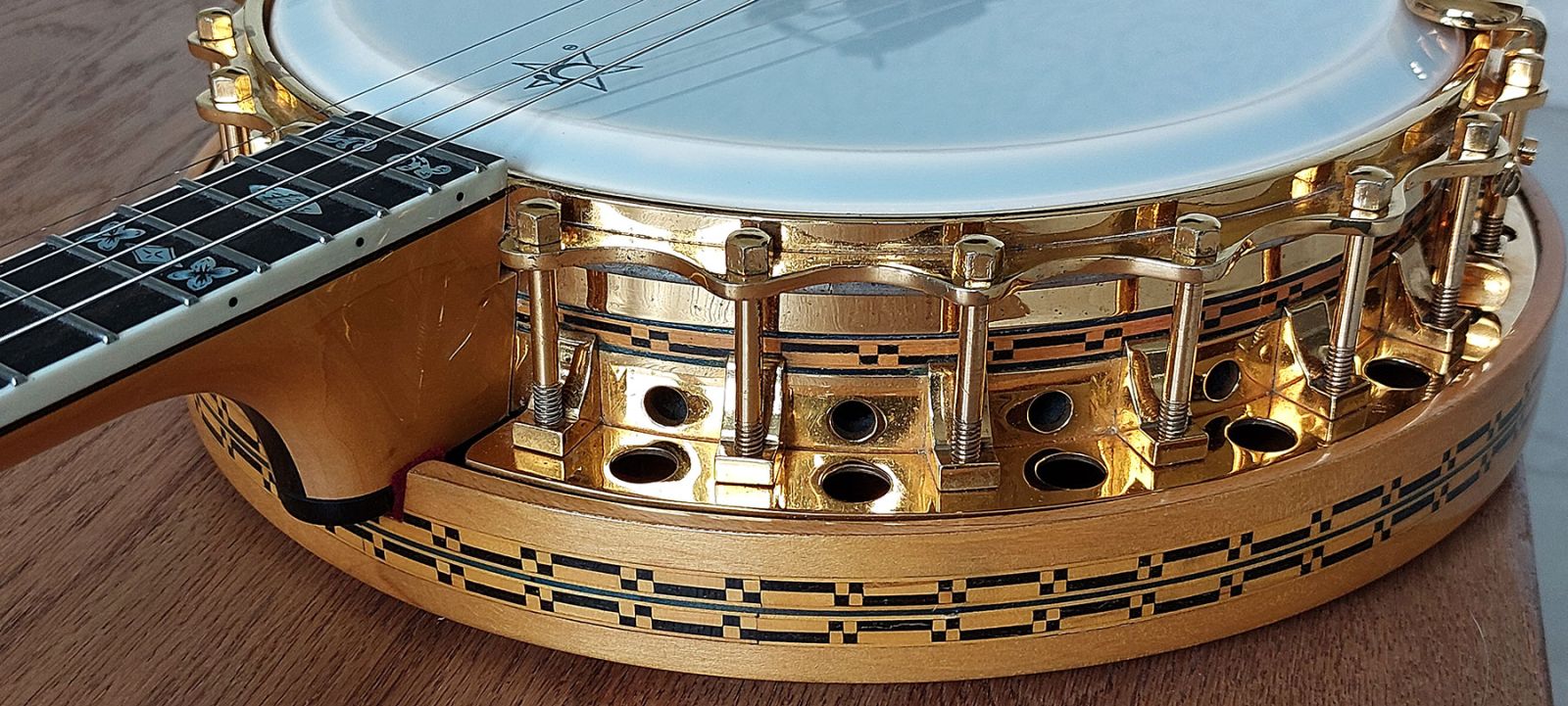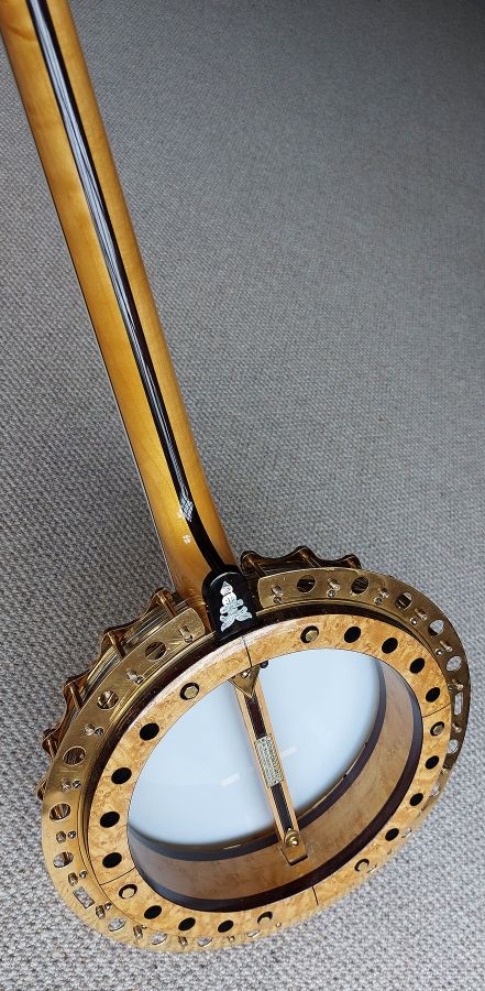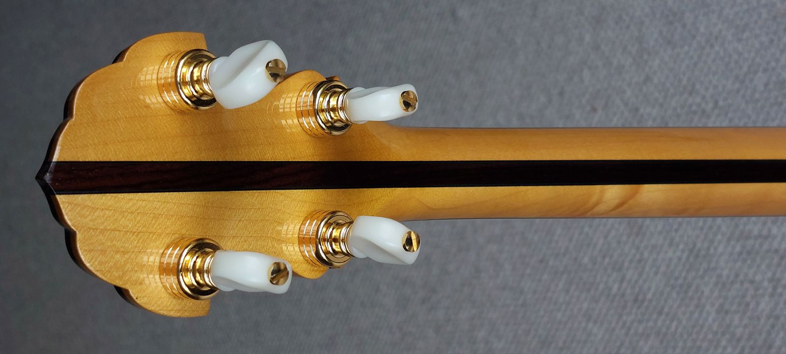 Clifford Essex top tension 19 fret tenor banjo, which started its life as a plectrum banjo and was professionally converted to a tenor by the renowned luthier Robert Aylward. This may have been a special commission as I haven’t seen this model in gold plating before. The top tension Paragon sound different to the CE models, the sound projection from the tone chamber excels power and pure tone. When you want volume, you got it, when you want sustain, you got it. As with the Epiphone range of tenor banjos, Clifford Essex Paragon stand side by side in the ranking of ‘want to own’ top tenor banjos.