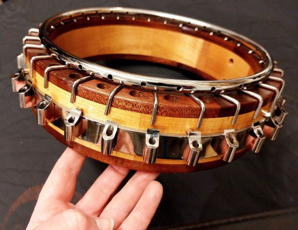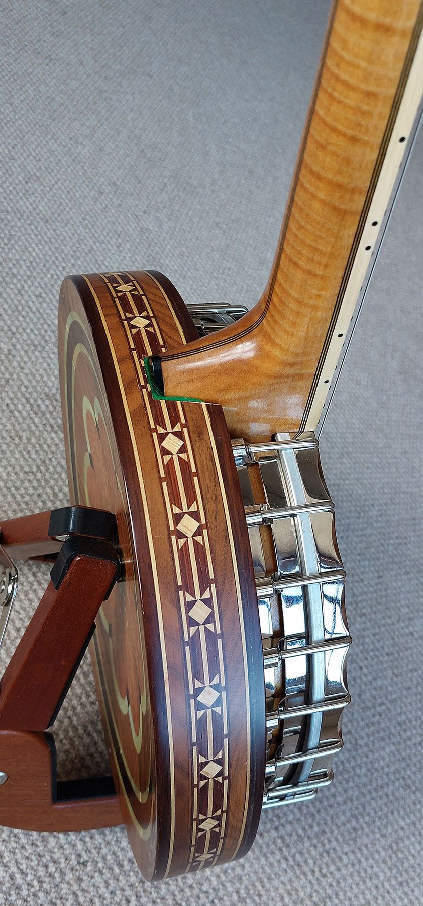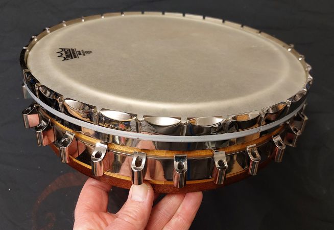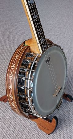 The neck is 32mm width at the nut and has a scale length of 23.5″. The lathe turned rim is made from rock maple capped top and bottom with rosewood. The rim design has 24 drilled holes to channel the sound waves from the tone ring. The shoes are mounted on the side skirt, similar to the vega artist design and the flange has the circular hole design. Fitted with white smooth top 11″ med crown head, which if preferred can be swapped over for clear or renaissance head. The scalloped tension ring, tailpiece, tone ring and flange setup are all original Paragon parts. The multi layered mixed laminated resonator design is very tastefully made and is concaved to match the Paragon design. The banjo has all of the sound characteristics of the original model which you will hear in the video. Comes with a newer type Clareen hardshell case.