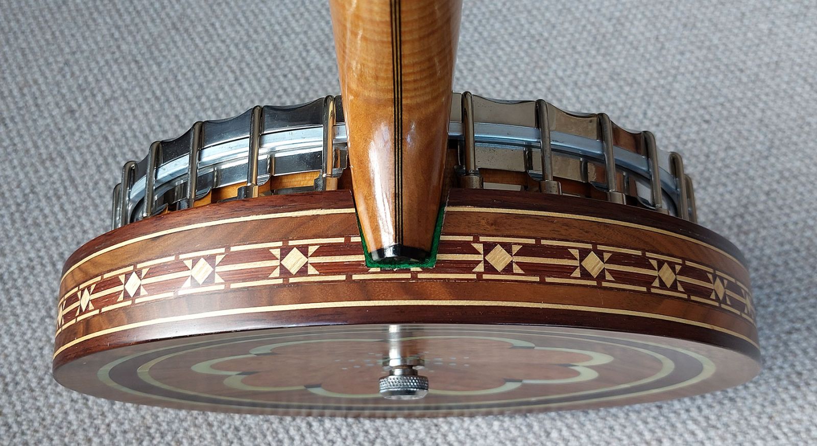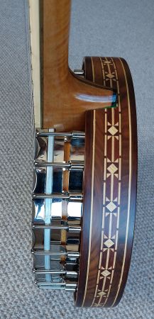 A quality built 19 fret tenor banjo using the best woods and reproduction Paragon banjo parts. The banjo was built in 2014 by Jim Patton using the exact build plans as Essex banjos in the 1930’s so every detail is as accurate as the original. The figured maple neck is multi-laminated both in the centre and under the fret board for strength and stability. Ebony fretboard with white side binding and fancy mother of pearl position markers. The ebony headstock is also identical to the original Mother of pearl design bearing the name of the owner Parajim (instead of Paragon). Jim Barcoe had plans to begin manufacturing these Paragon replica’s and had a total of 3 built, but sadly passed away in 2018. This banjo is with currently me which is on consignment from his son to sell on his behalf.