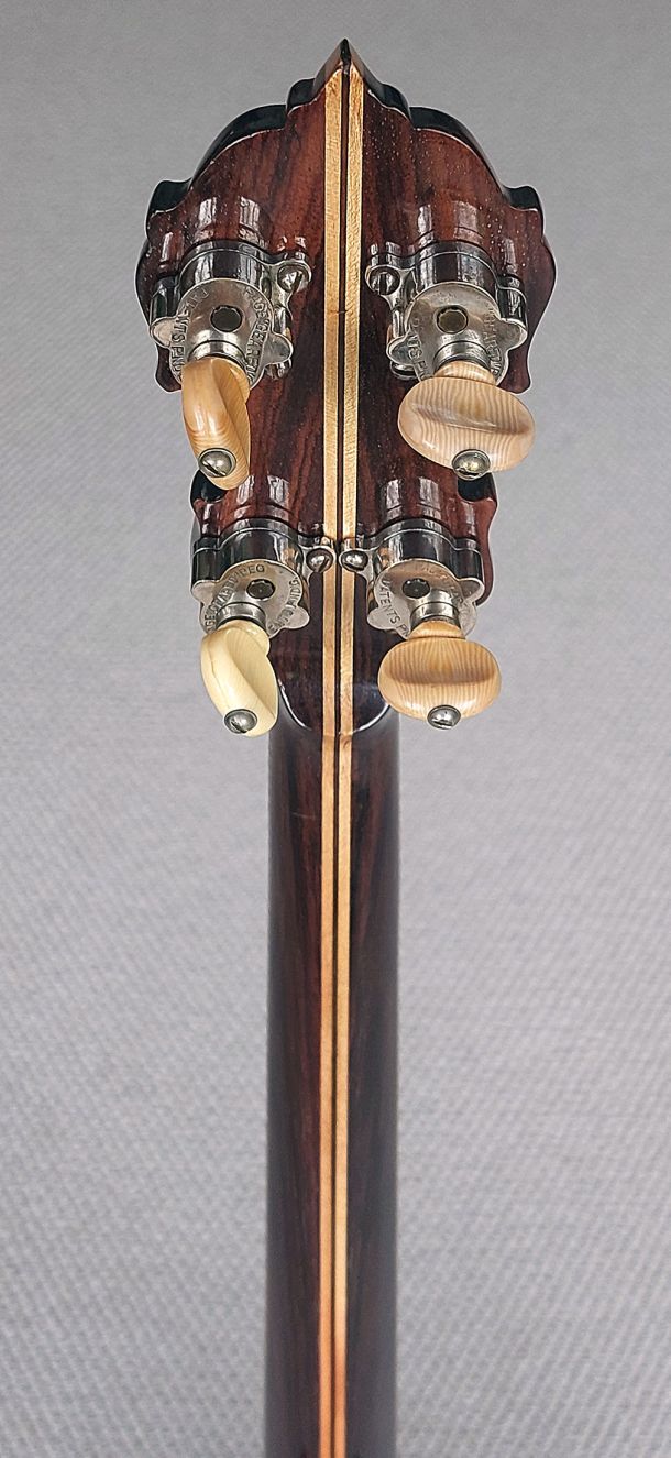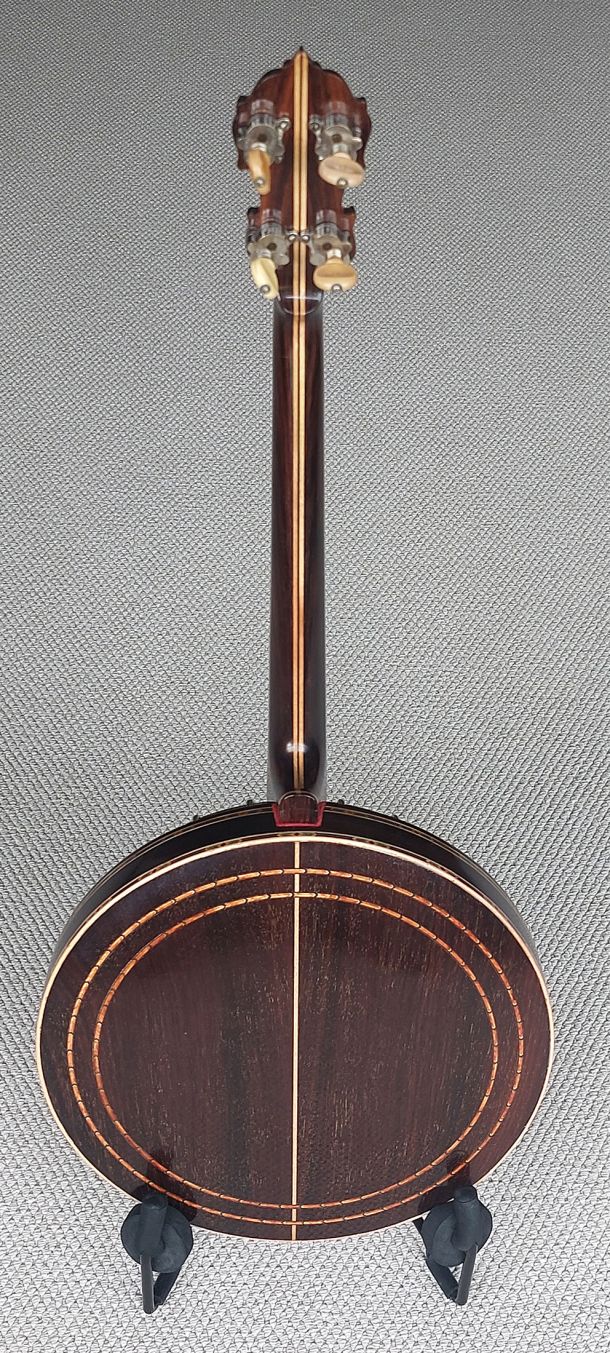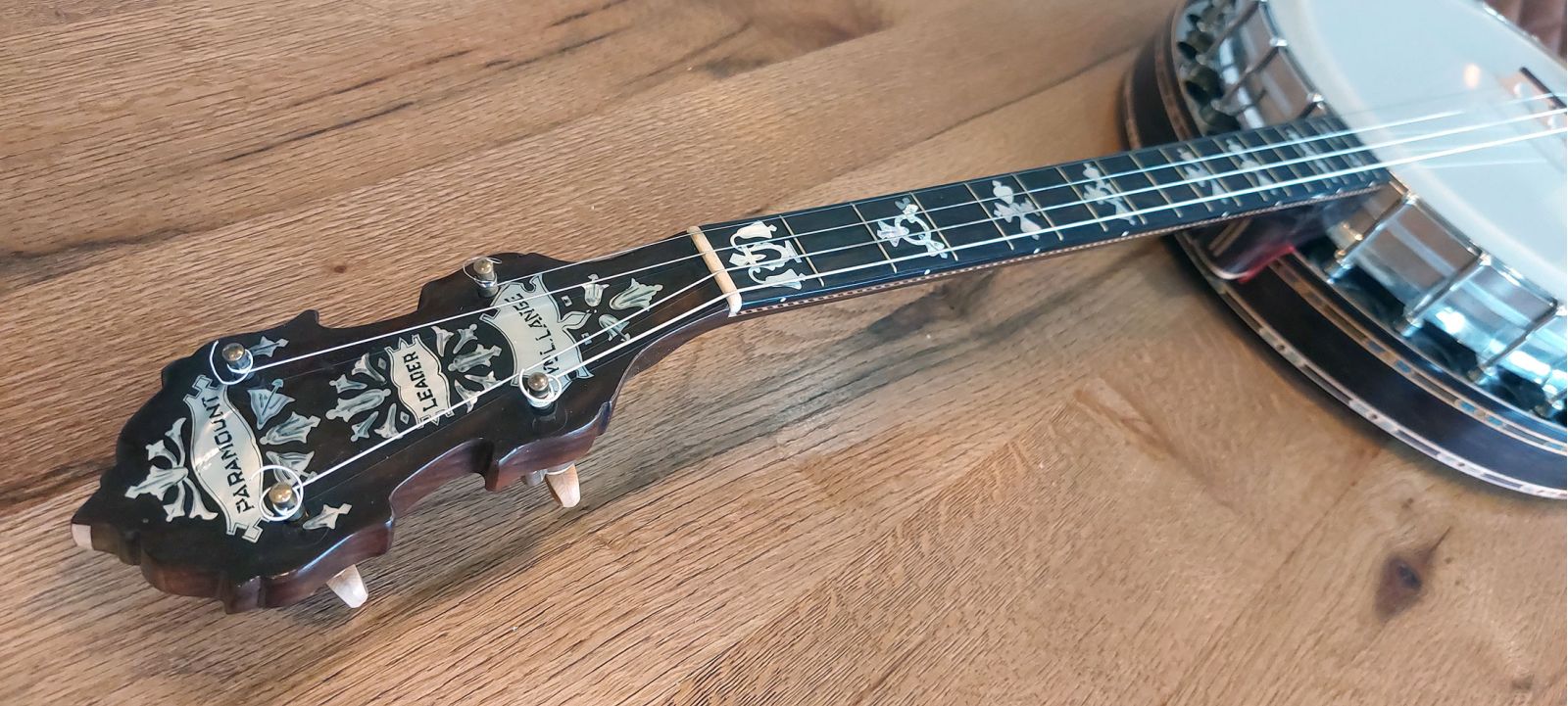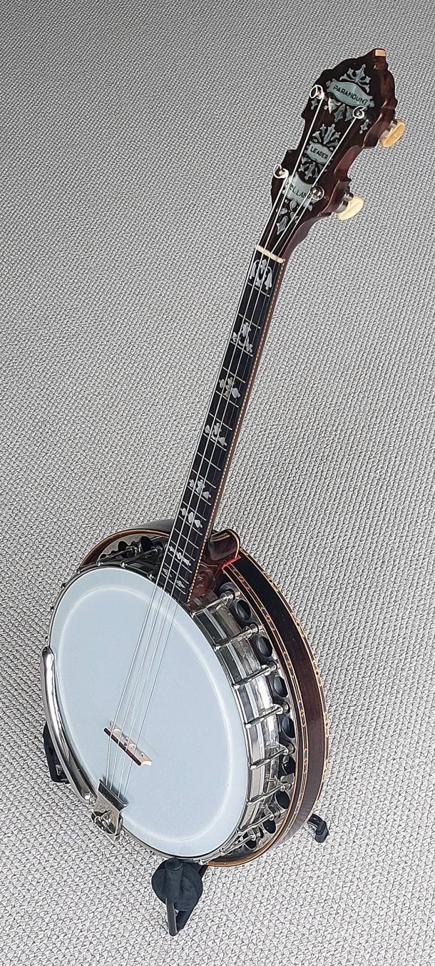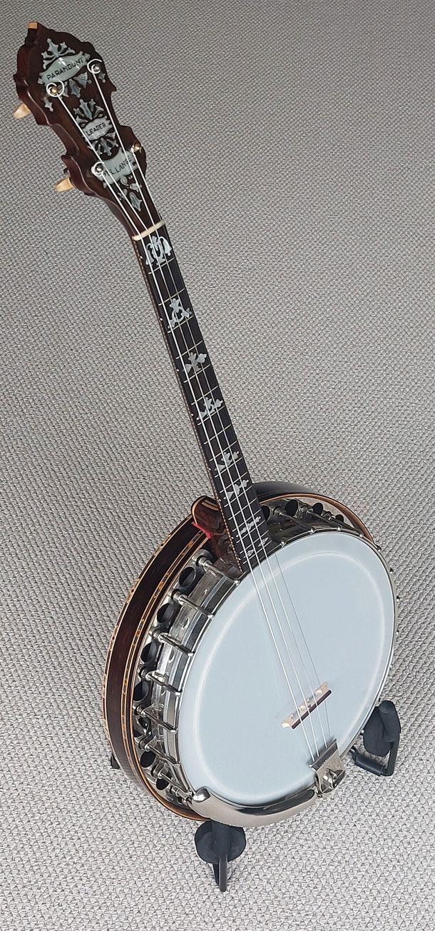 Paramount Leader 17 fret tenor banjo from the famous William Lange Banjo Company, New York. The matching neck & rim serial numbers SN: 3633 make the build date 1924, so its 101 years old! Made from quality Brazilian rosewood the resonator is decorated with maple/pearwood centre stripe and outer concentric circle rings, 5 piece Brazilian rosewood / maple neck, with checkerboard trim under the bound Brazilian rosewood fretboard. Headstock overlay features logo, model and floral inlays, Leader style inlay pattern up the fretboard, 17 frets, newly fitted 11- 2/16″ Remo renaissance head, 24 brackets, round hole flange, raised archtop tone ring, Paramount swivel lock tailpiece, flat bar armrest, solid brass page tuners (the indestructible preferred type). Comes with new short scale tan leatherette hard shell case in with red fur lining. The banjo has been very well cared for throughout its lifetime as seen from the photos, straight neck and powerful sweet sustain from the archtop tonering. The frets are all good, straight neck and low action which is very easy to play up the fretboard. The neck is as sleek as a fiddle neck so would definately suit a fiddle player.