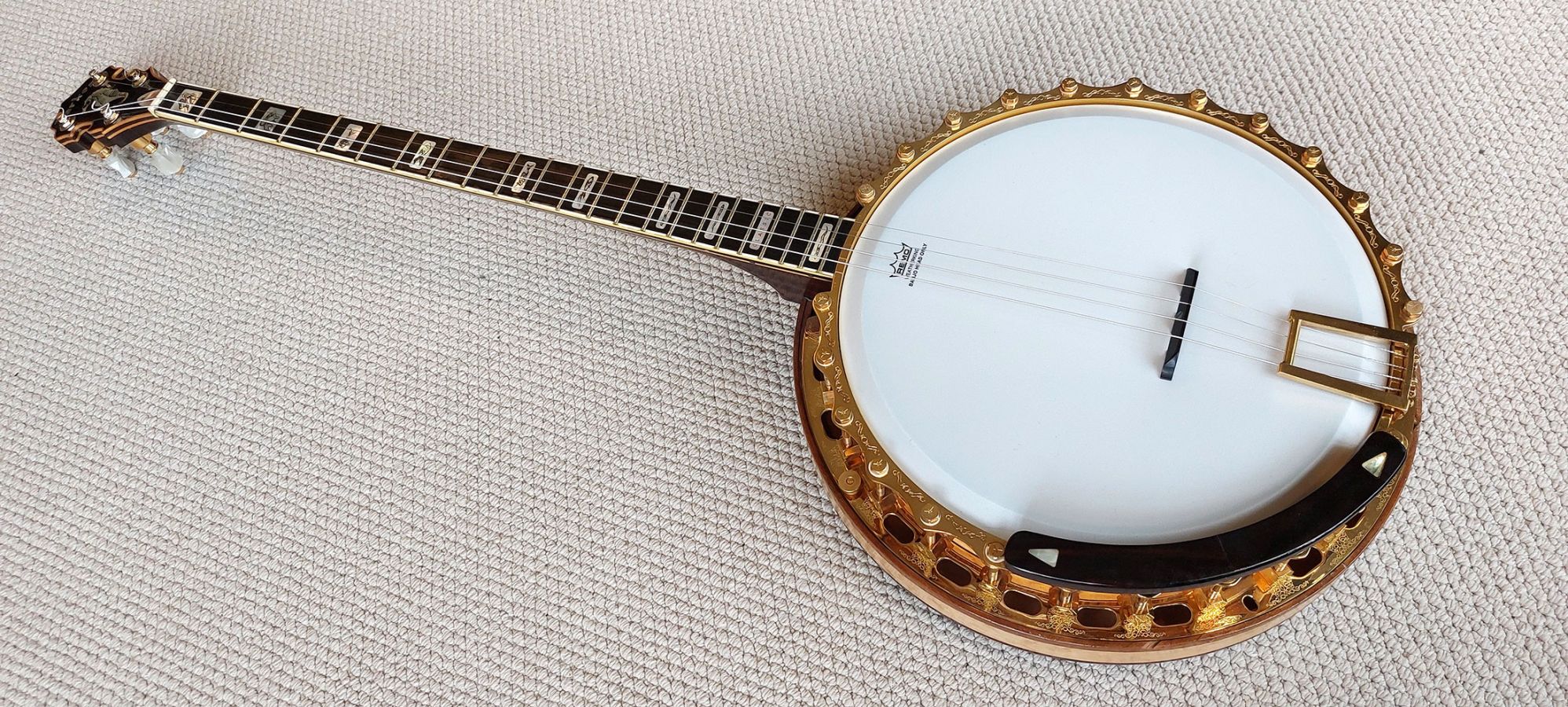 Absolutely stunning Parker Tenor Banjo, an all-time classic from Alf Parker’s workshop in Penzance, Cornwall. A beautiful mixture of maple and rosewood with gold-plated and engraved hardware, top tension, ebony fingerboard, engraved block pearl inlays, in excellent condition. Original Parker HSC. This banjo shows top quality craftsmanship featuring exotic tone woods and unusual sea life inlays probably inspired by Alf Parker’s geographic location. Gold plating is in very good condition as is the beautiful maple lacquer finish
