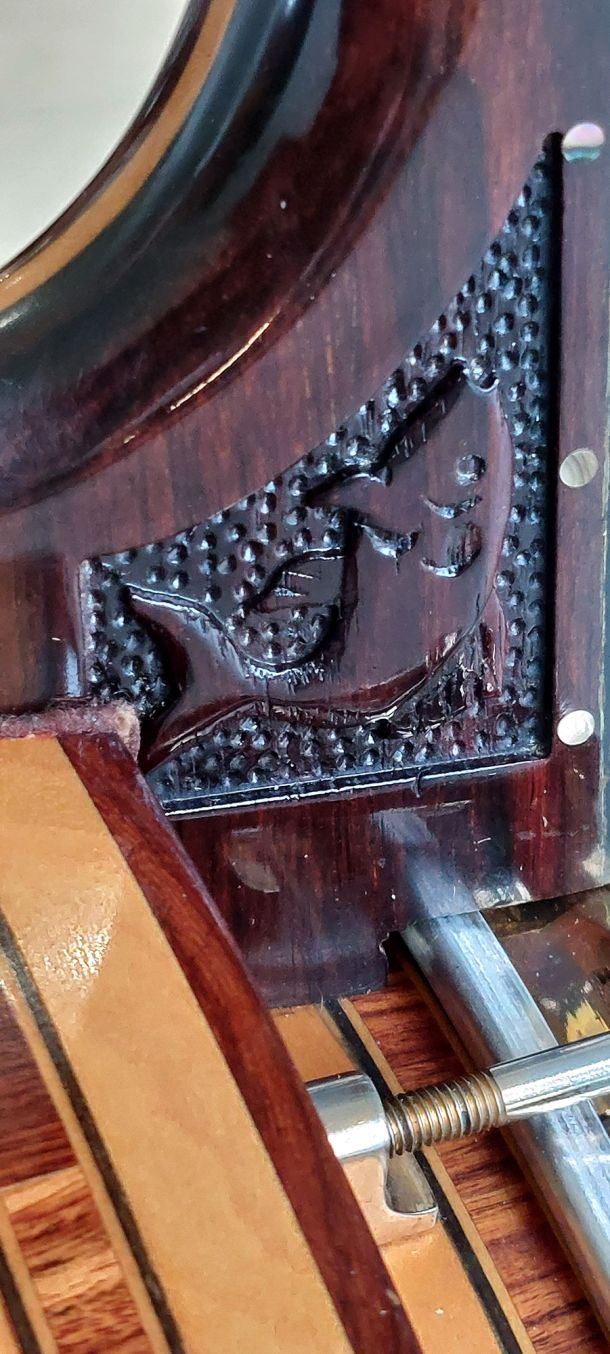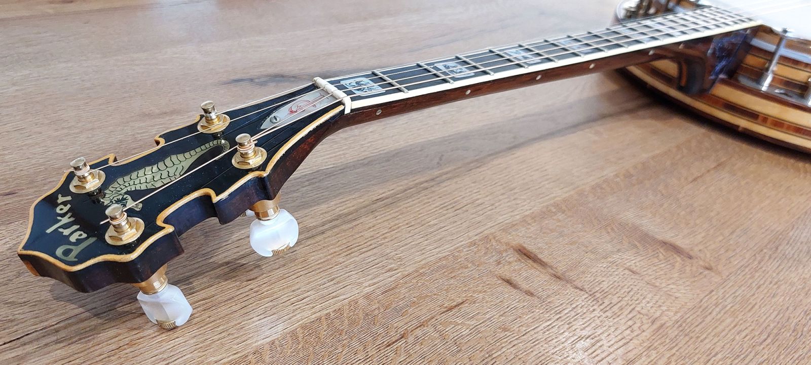 Absolutely stunning Parker Tenor Banjo, an all-time classic from Alf Parker’s workshop in Penzance, Cornwall. A beautiful mixture of maple and rosewood with gold-plated and engraved hardware, top tension, ebony fingerboard, engraved block pearl inlays, in excellent condition. Original Parker HSC. This banjo shows top quality craftsmanship featuring exotic tonewoods and unusual sea life inlays probably inspired by Alf Parker’s geographic location. Gold plating shows signs of age/wear on tension hoop and flange.
