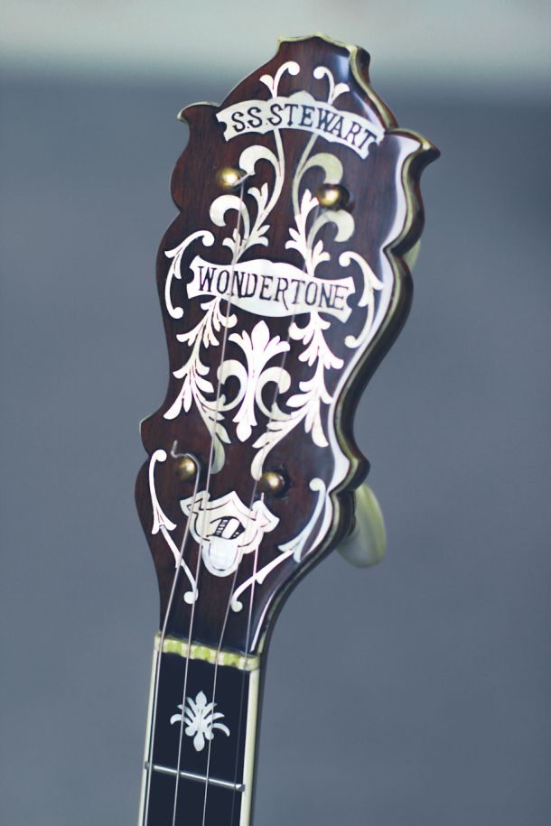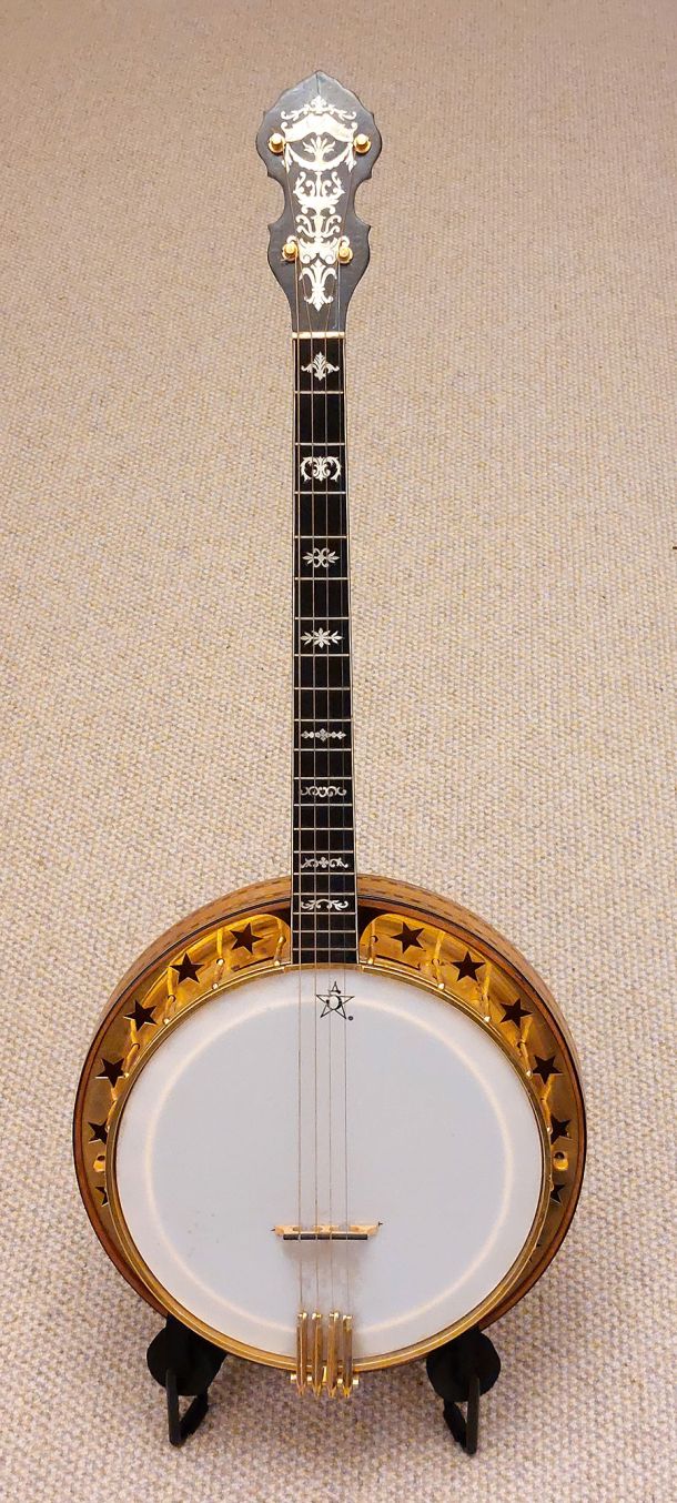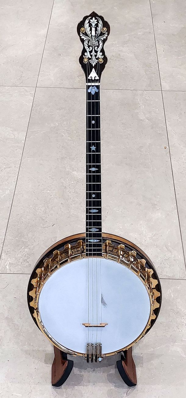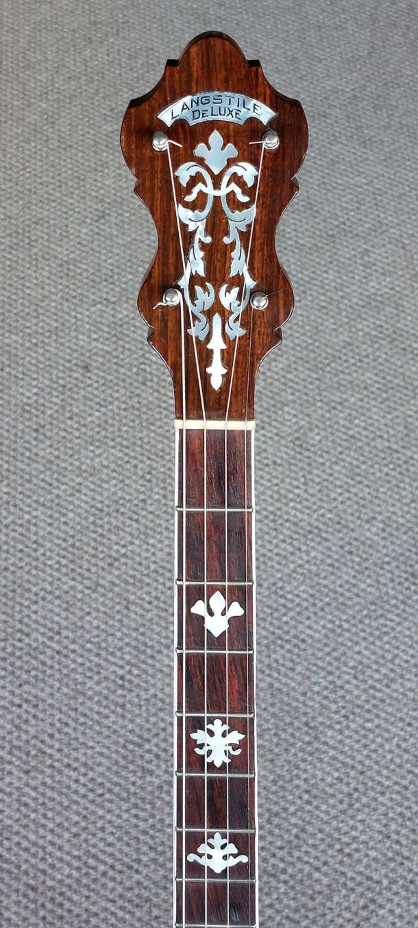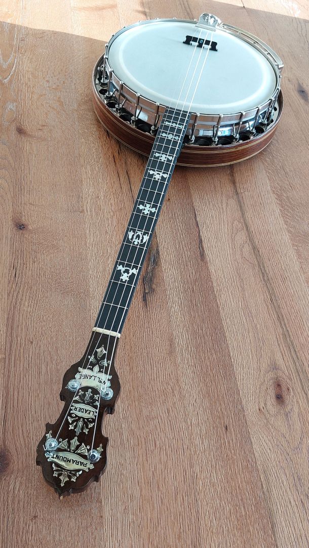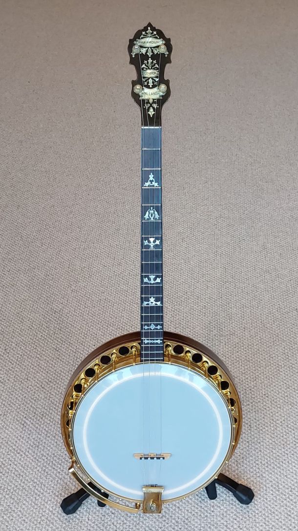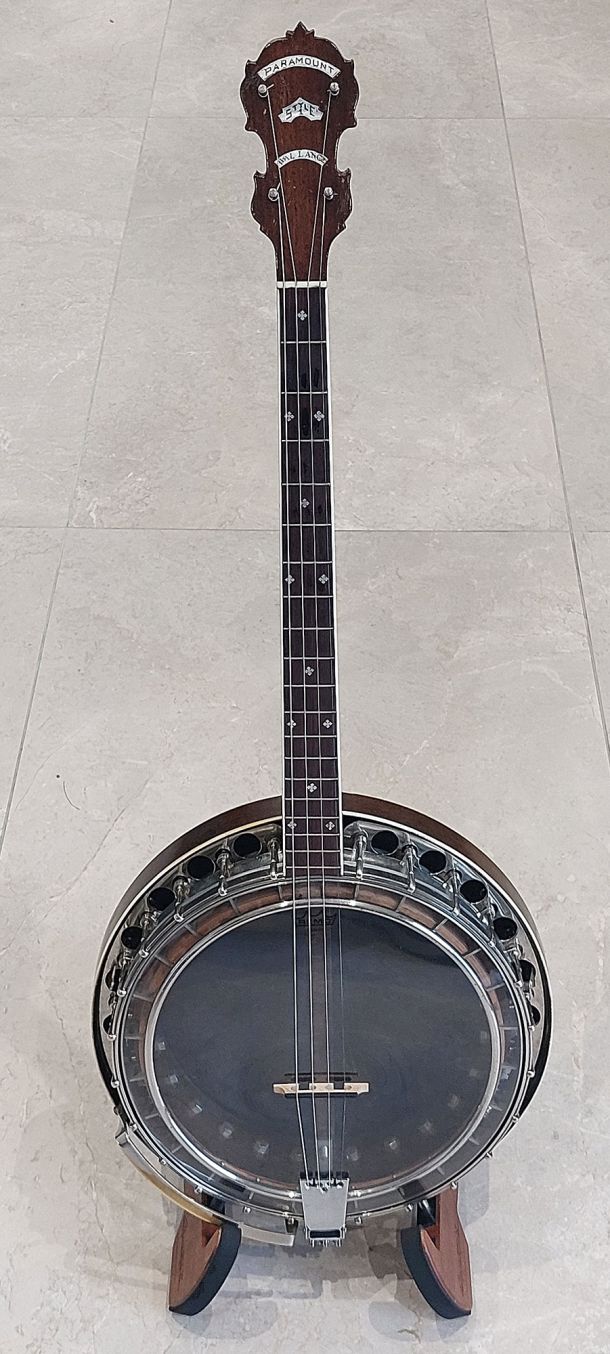 Top of the line Paramount Style F 19 fret tenor banjo, the original highest grade model in William Lange’s professional banjo line.
