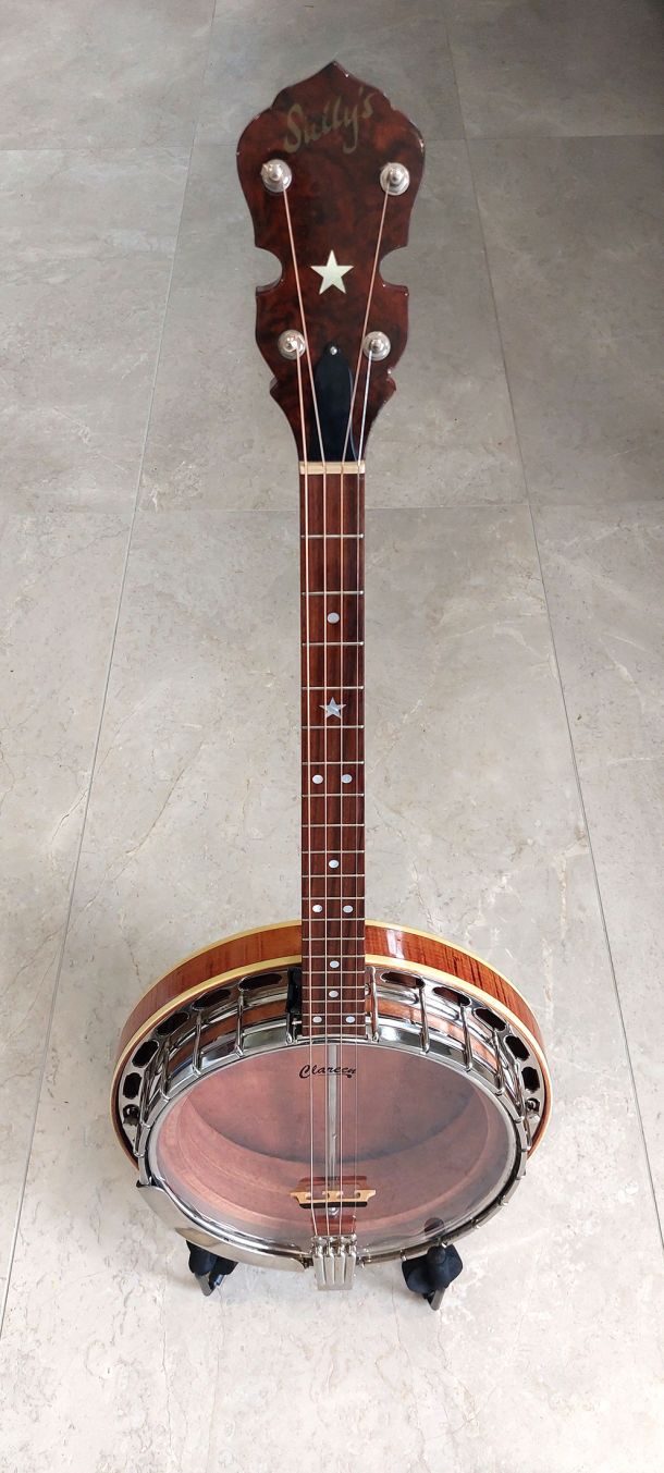 Sully Whyte Ladie model standard scale 19 fret resonator tenor banjo built in 1990 by Tony Sullivan, with serial #22. Fitted with a Whyte Ladie tone ring seated on a 3/4″ solid maple rim, which gives this little gem its shear power and sustain. All parts are of the finest quality as you’d expect from Sullivan banjos, 1/2″ notched brass tension hoop with 24 hooks and rounded nuts. Clamshell tailpiece, armrest, 5 Star geared tuners fitted with pearl style buttons. Rosewood fretboard with MOP dot inlay position makers, good frets and low action. The nut width is 30mm and the scale length from the inside nut to the bridge is 23″. Gibson style flange, attached to a figured maple resonator with white binding to the sides. All together a fine modern banjo that can accommodate a fishman pickup if you fancy using for gigs. The metal work is first class and the lacquer shows no wear, this banjo has been well cared for and is now 35 years old. Comes with a modern hardshell case.