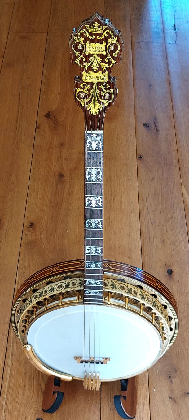 The most elaborate of the Super Paramount line was the Artists Supreme, with engraved inlays on the head and fingerboard, marquetry on the resonator, and an engraved celluloid sidewall. It is a spectacular instrument.