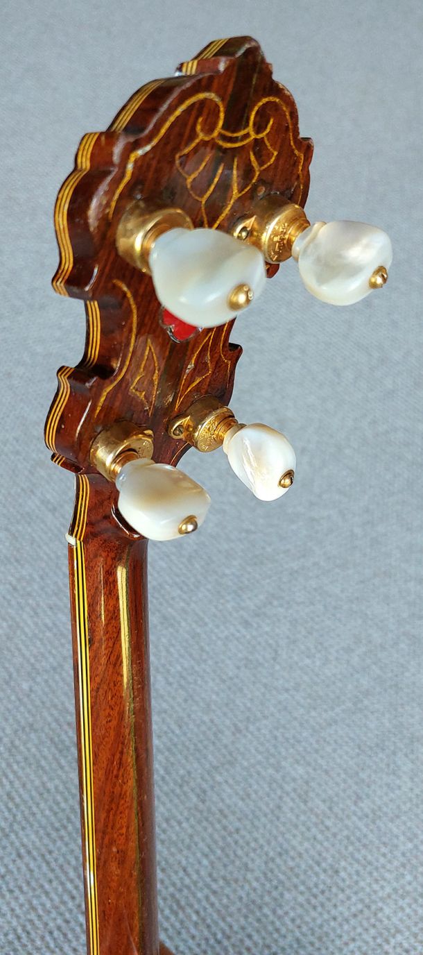 All Super Paramount banjos had a double stepped resonator, unique to Paramount, and not seen on any other banjo. All three models came with a large one piece tone modifier tailpiece mute. Fitted with Page tuners, rosewood neck and resonator with elaborate wood marquetry inlay. The fretboard is also rosewood with engraved fancy mother of pearl inlay position markers. The headstock mother of pearl is beautifully ornate MOP with multi laminated wood veeners. The unique Paramount double flange has an engraved cream celluloid sidewall on the upper flange, gold plated and fancy engraved hardware and a carved heel.