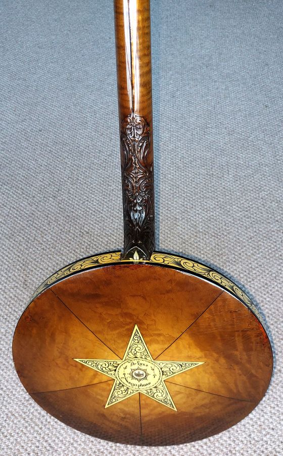 Vega Vegaphone Artist Deluxe Model Tenor Banjo, manufactured 1927, made in Boston, Mass., serial #90730 shaded maple finish, flamed maple 3 piece neck, piecrust resonator with cream plastic side walls tastefully engraved and infilled in contrasting black. The centre of the resonator features a large cream ivoroid star tastefully engraved with the name ‘Vegaphone Deluxe’. The engraved flange is the four section type rather individual flange plates. This is a completely original example of one of the finest “Industry Standard” Orchestra tenor banjos from the 1920s, the Vegaphone Artist Deluxe (top of the line). Vega’s “Vegaphone” line was introduced in 1923 as an answer to the Paramount line of resonator-and-flange banjos. Essentially a long-scale tenor Tubaphone with a resonator and multi-flange system, the Vegaphones were an instant success, and along with the Paramounts established the basic design of the modern banjo. The Artist Deluxe is first in a 3-banjo line, although a fourth, the Soloist, was added below it not long after. The Artist was quite a high-priced instrument for the time, selling originally for $250.00. It features all of Vega’s high-grade construction features and fairly fancy decoration, including gold-plated metal parts and elaborate engraved pearl inlay on the headstock, fingerboard, and heel cap. All workmanship is to the highest level, as is common with Vega. There is elaborate engraved varied shaped pearl inlay in the heavy bound ebony fingerboard, with a 3-piece shaded maple neck featuring a carved heel and fancy pearl inlay heel cap. The pearl head plate inlay is Vega’s fanciest floral pattern also featuring the Vega star inlay on the back of the headstock. The original gold Planet tuners all work perfectly, holding tuning well and feature solid pearl buttons. The gold-plated Oettinger adjustable tension tailpiece has each arm engraved in turn “Vegaphone-Artist-Deluxe-155 Columbus Ave. -Boston”.