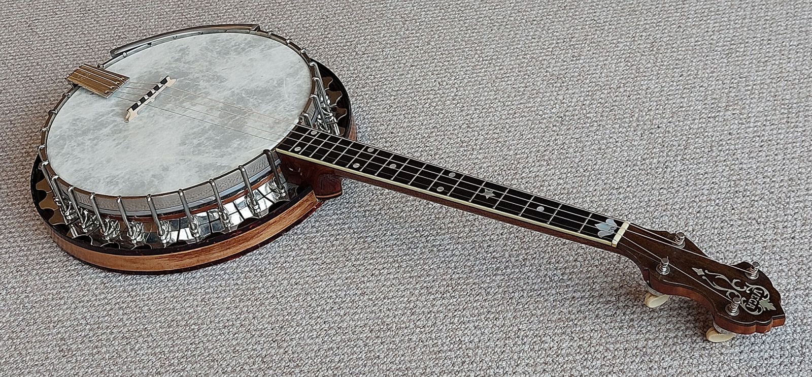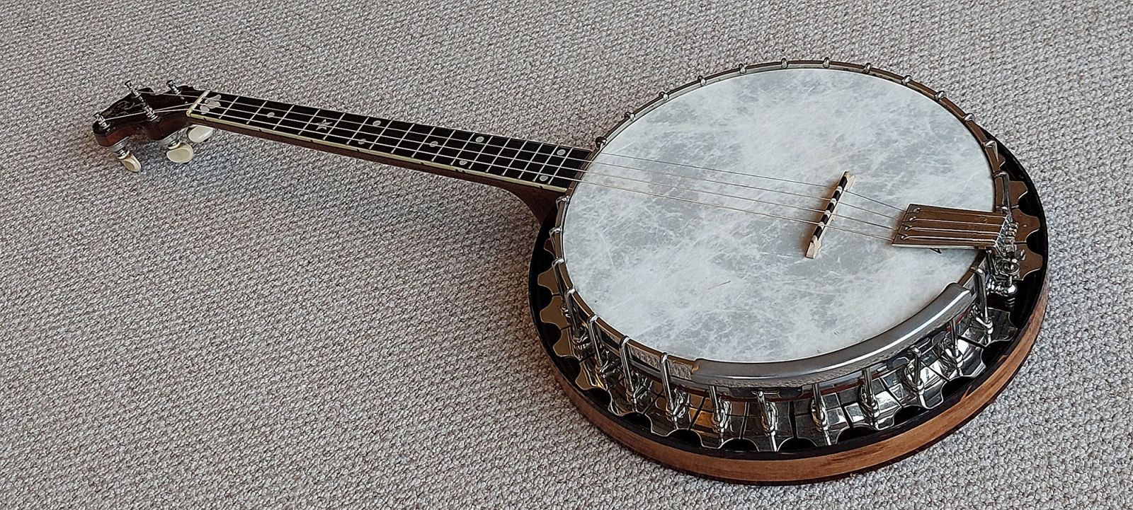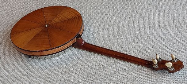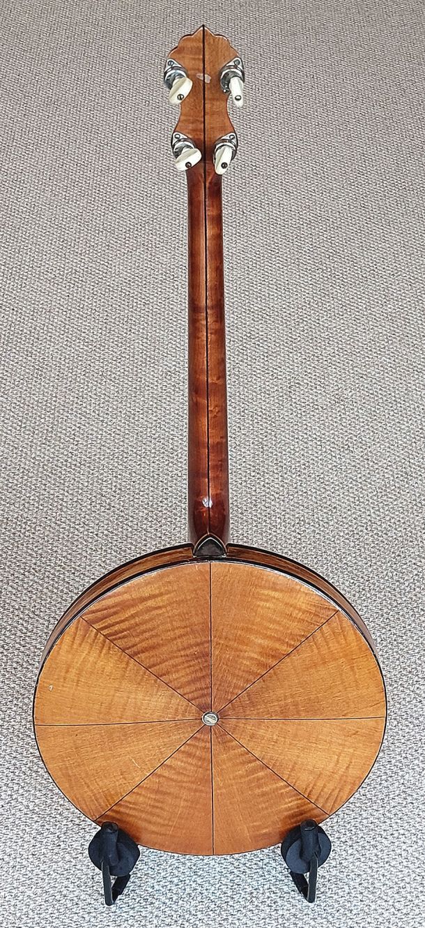 This banjo is almost 100 years old and is in excellent original condition. The varnish finish and nickel plating are in excellent condition throughout. The neck is straight with low playing action and the frets are all good. Fitted with a Remo fibre skin head which usually gives a duller bassier sound, but not in the case with this banjo. The banjo sounds bright with good sustain.