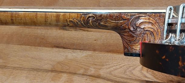 This little beauty is in very good condition with no damage or repairs, the back of the resonator is also unstratched, although some indentes are visable around the tension hoop. The serial number is # which makes the year build around 1923. The neck is made from select ornate figured maple with centre ebony strip and stained dark walnut overlay from the back of the head stock down the neck. The style X has a floral mother of pearl design on the rear of the headstock and the classic Vega MOP to the front. The fretboard is ebony with good frets and straight neck and has the Vega MOP position markers down the fretboard and cream celluloid binding on the sides. The style X must have one of the most beautiful carved heels and complimented with a ebony heel with another beautiful intricate MOP inlay.