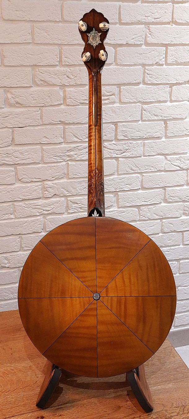 Inside the rim you can see the beautiful checkered wood marquetry, this banjo can be played as an open back or by simply removing the pie crust resonator held in place by a screw bolt. This particular resonator has the dark red pyralin banding around the sides. I recently fitted the banjo with a new Remo white head which has tremendously enhanced the volume and clarity of this banjo. If you are looking for a beautiful high end short scale tenor banjo in great condition this is a great choice. Has to be played to be appreciated.