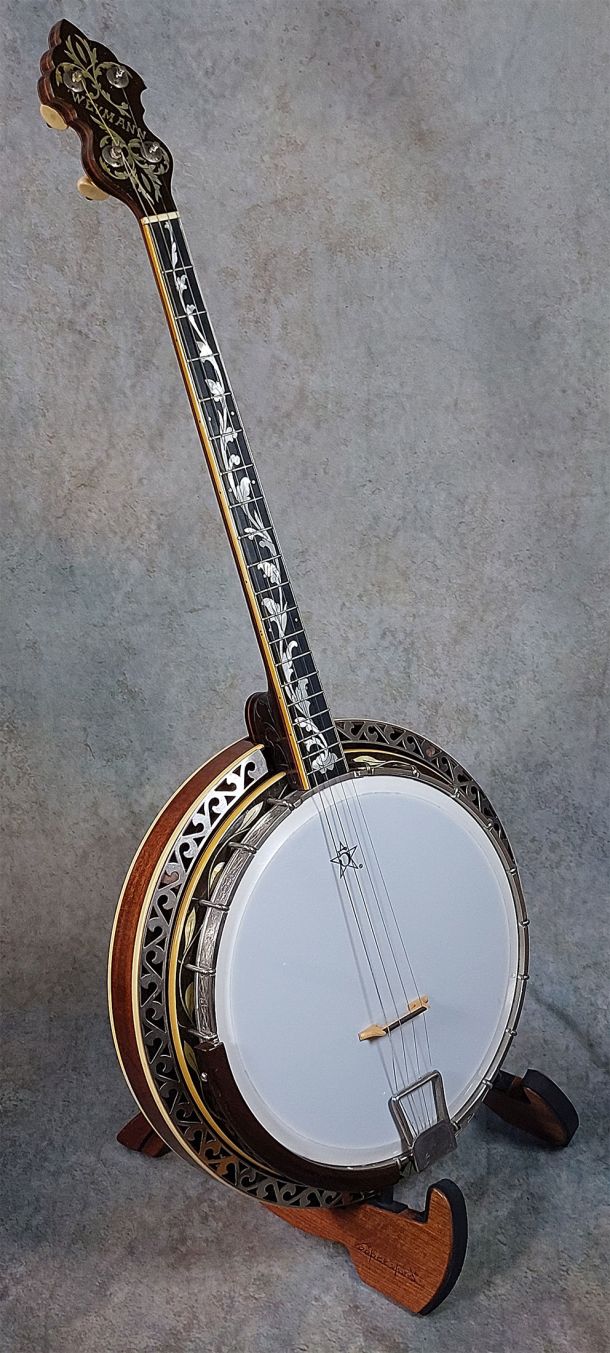 The megaphonic rim is also made from quality rosewood, with the upper edge inlaid with purfling and bound with ivory celluloid. The top of the rim is veneered with ebony and inlaid with pearl in the form of ornamental leaves. The notched tension hoop is hand engraved with nickel plating as is the 20 bracket hooks and nuts. The banjo is fitted with a 5 star white smooth top head.