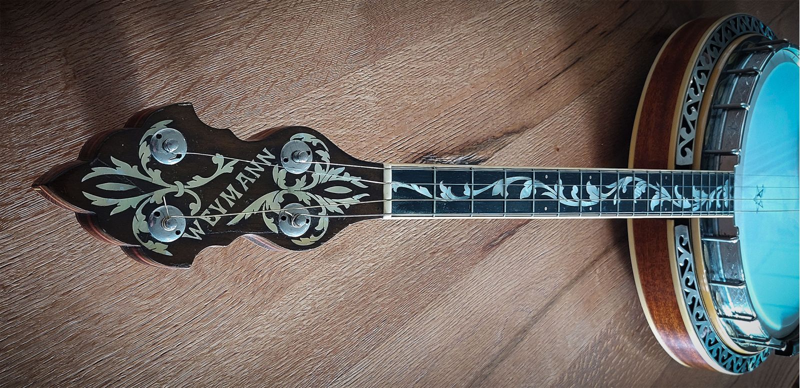 1928 Weymann Orchestra Style 4 tenor banjo made in Philadelphia, USA. A very classy banjo with neck & rim and made from Brazillian rosewood and nickel plated metal parts throughout.