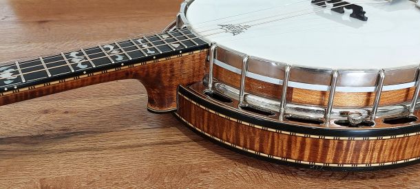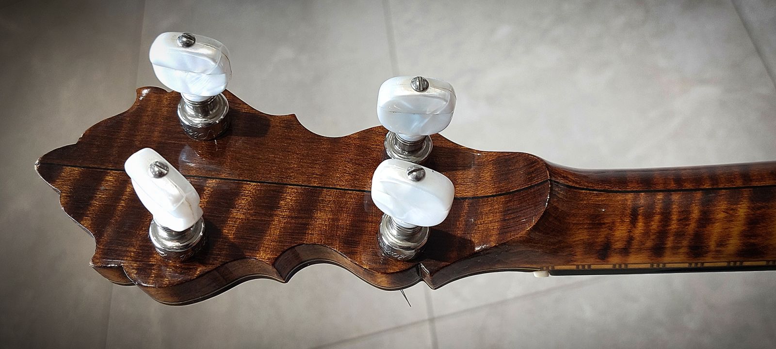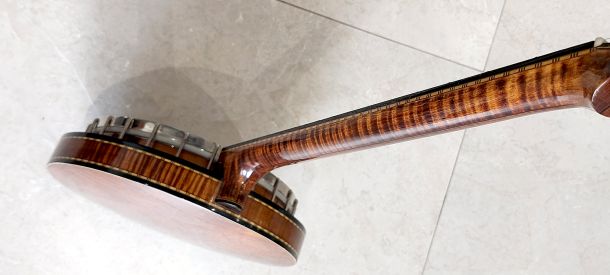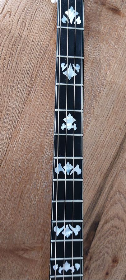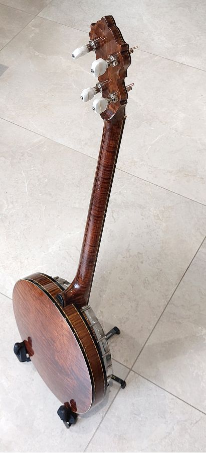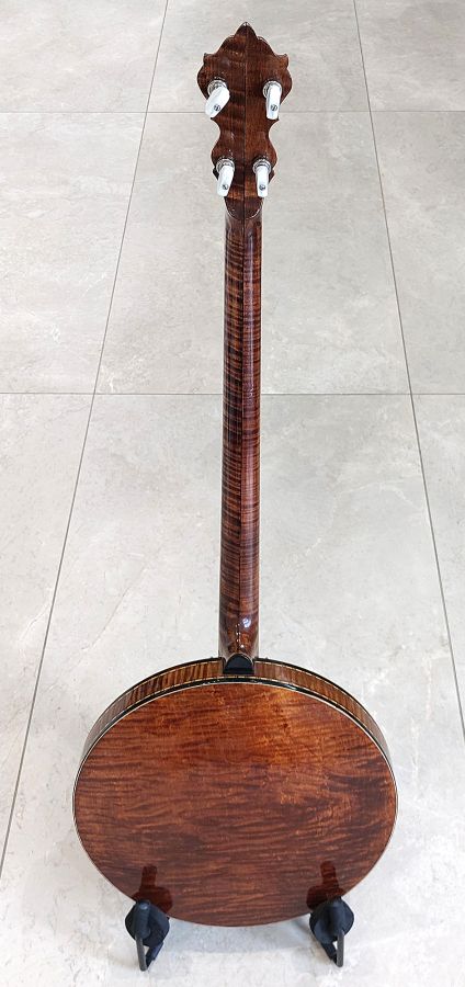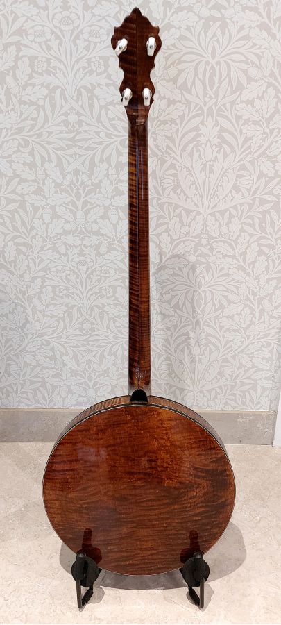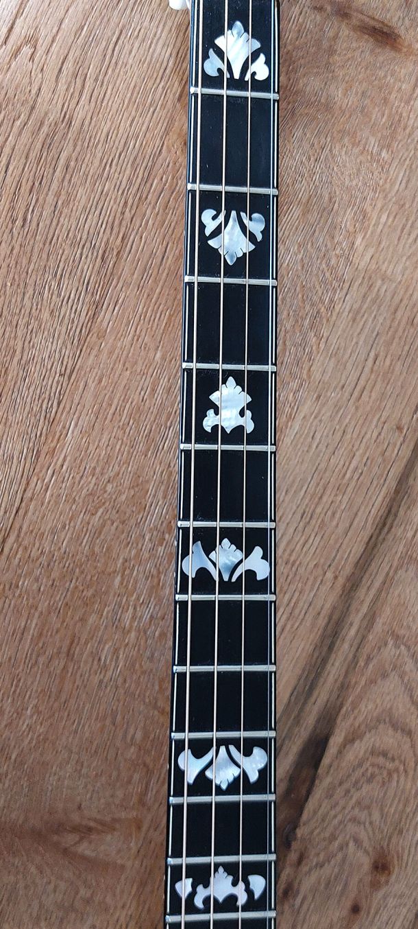 Here we have a beautiful 22 fret flamed maple plectrum banjo, possibly made around 2002. Features a three piece flamed maple neck with centre ebony laminate & ebony heel cap. Elaborate hand cut mother of pearl headstock with planet geared tuners and pearl effect buttons. Ebony fretboard with floral style mother of pearl position markers and white side dots. The side of the neck features black side binding and wood marquetry. The neck is perfectly straight with excellent frets and the security of a fitted adjustable truss rod.