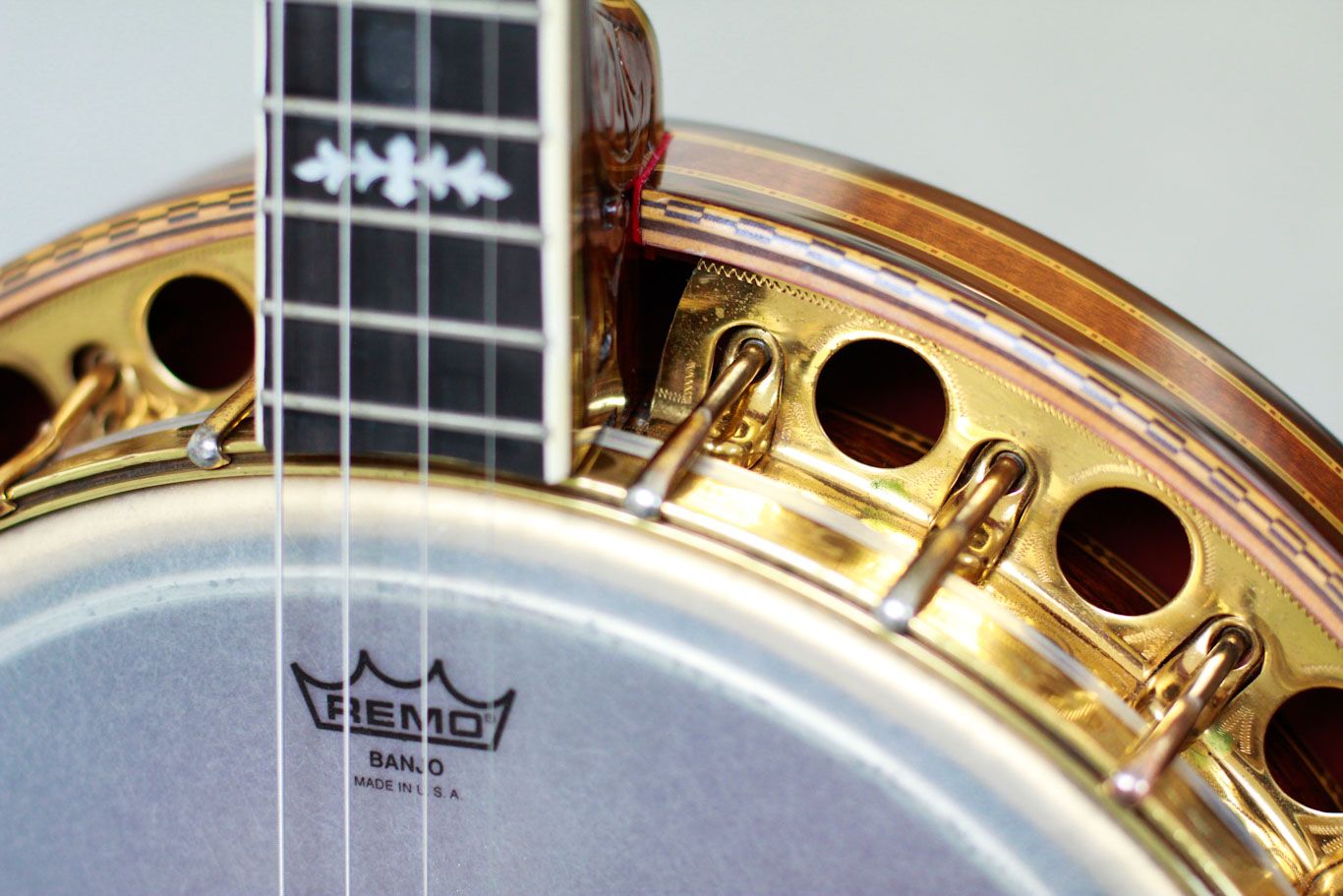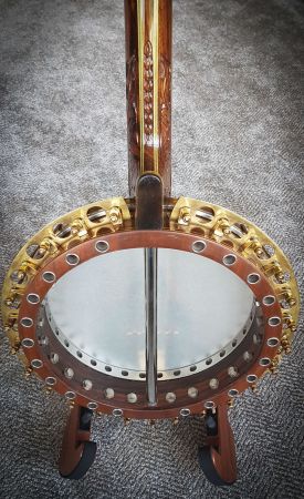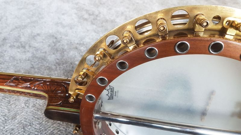 The renaissance head is set on a heavy nickel ring close to the edge of the hoop. A 3/4″ – inch wide perforated nickel hoop set on the wood rim, but kept free to allow proper vibration and set under the head forming a 1″ bevel. The rim has 22 perforations, 1/2″ in diameter, and is connected with a perforated tone ring under the renaissance head forming a manifold tone chamber which enhances the volume of the tone. Attached to the outside of the rim is an additional metal perforated tone chamber, connected with a convexed extension overhanging built up resonator.