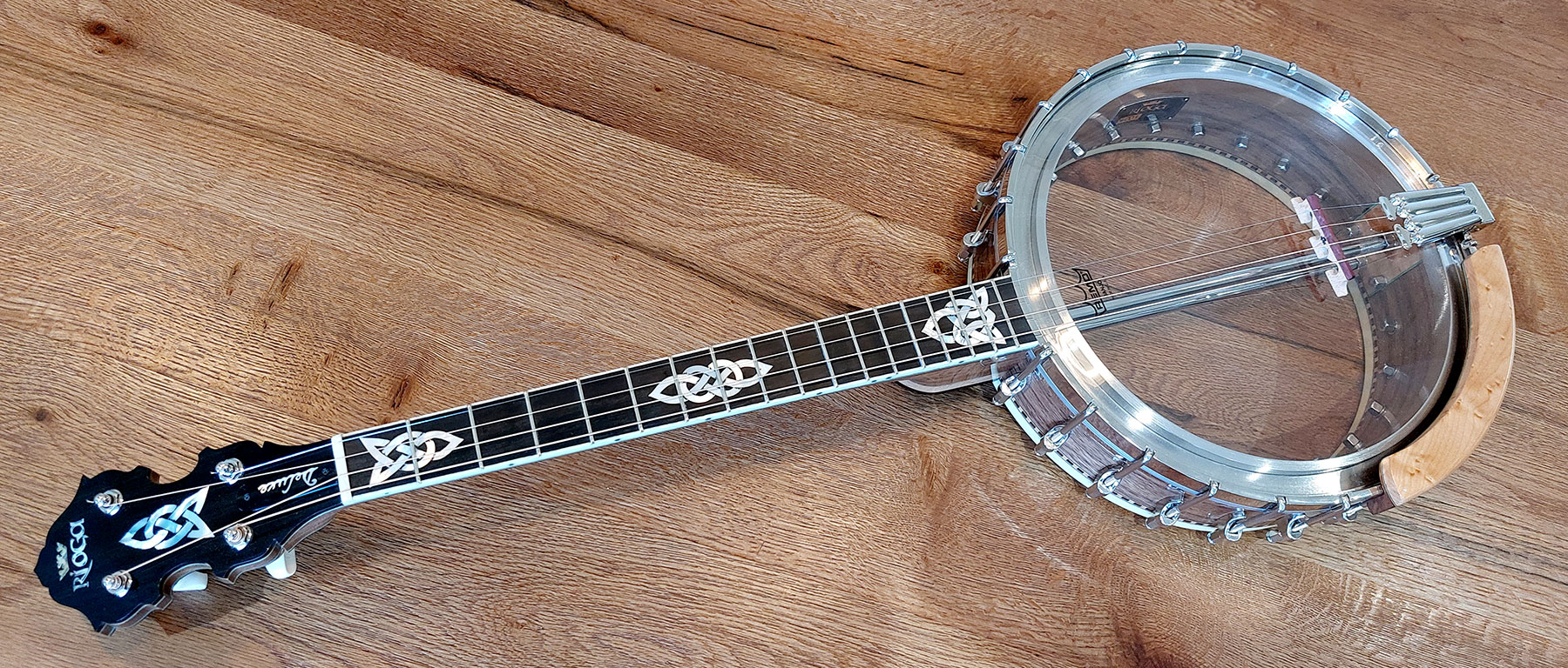The pot is made from solid block maple, lathe turned with cocabola rosewood tone ring and cocabola bottom capped rim. 24 shoes with round hooks and nuts and notched tension ring. The neck is attached to the rim by 2 solid brass coordinator rods, made and fitted by Patsy Toman from Lurgan (Thanks Patsy). Fitted with Remo white top 11″ medium head. clamshell tailpiece, ebony/maple bridge and nickel plated armrest. The banjo has a beautiful rich woody tone with nice sustain and low action. Comes with a brand new Clareen Polyfoam case.