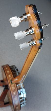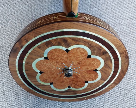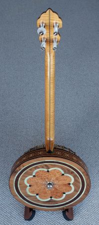 A quality built 19 fret tenor banjo using the best woods and reproduction Paragon banjo parts. The banjo was built in 2014 by Jim Patton using the exact build plans as Essex banjos in the 1930’s so every detail is as accurate as the original. The figured maple neck is multi-laminated both in the centre and under the fret board for strength and stability. Ebony fretboard with white side binding and fancy mother of pearl position markers. The ebony headstock is also identical to the original Mother of pearl design bearing the name of the owner Parajim (instead of Paragon). Jim Barcoe had plans to begin manufacturing these Paragon replica’s and had a total of 3 built, but sadly passed away in 2018. This banjo is with currently me which is on consignment from his son to sell on his behalf.