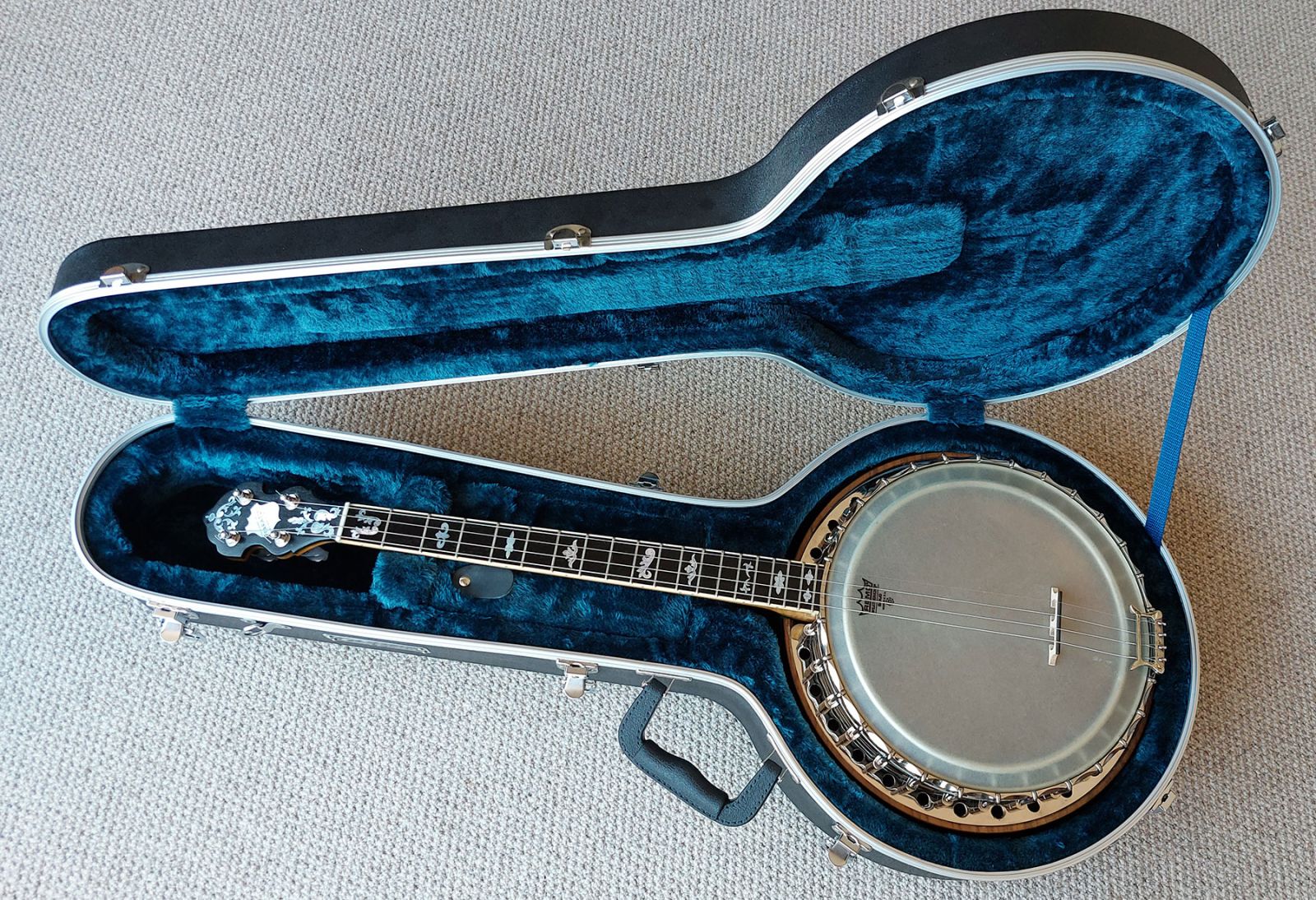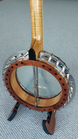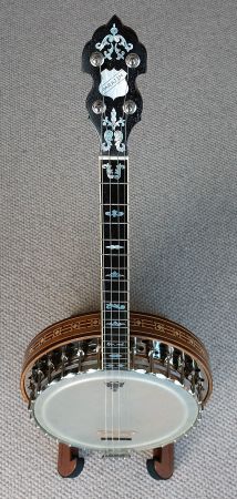 The neck is 32mm width at the nut and has a scale length of 23.5″. The lathe turned rim is made from rock maple capped top and bottom with rosewood. The rim design has 24 drilled holes to channel the sound waves from the tone ring. The shoes are mounted on the side skirt, similar to the vega artist design and the flange has the circular hole design. Fitted with white smooth top 11″ med crown head, which if preferred can be swapped over for clear or renaissance head. The scalloped tension ring, tailpiece, tone ring and flange setup are all original Paragon parts. The multi layered mixed laminated resonator design is very tastefully made and is concaved to match the Paragon design. The banjo has all of the sound characteristics of the original model which you will hear in the video. Comes with a newer type Clareen hardshell case.