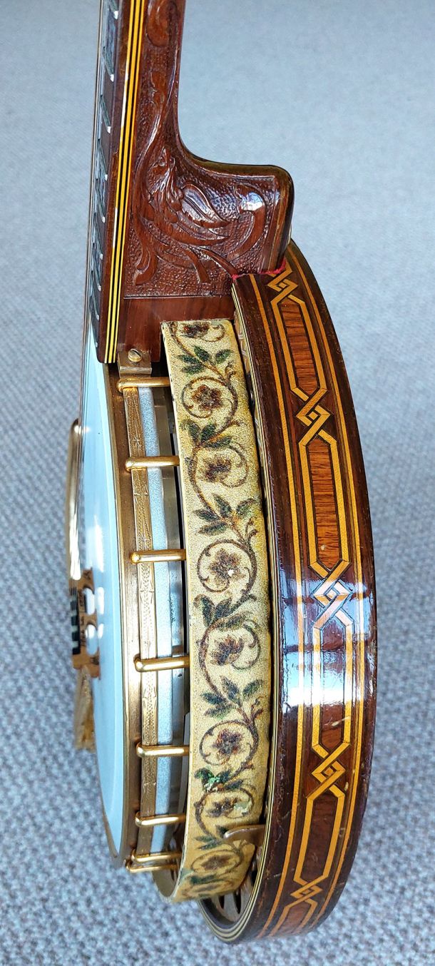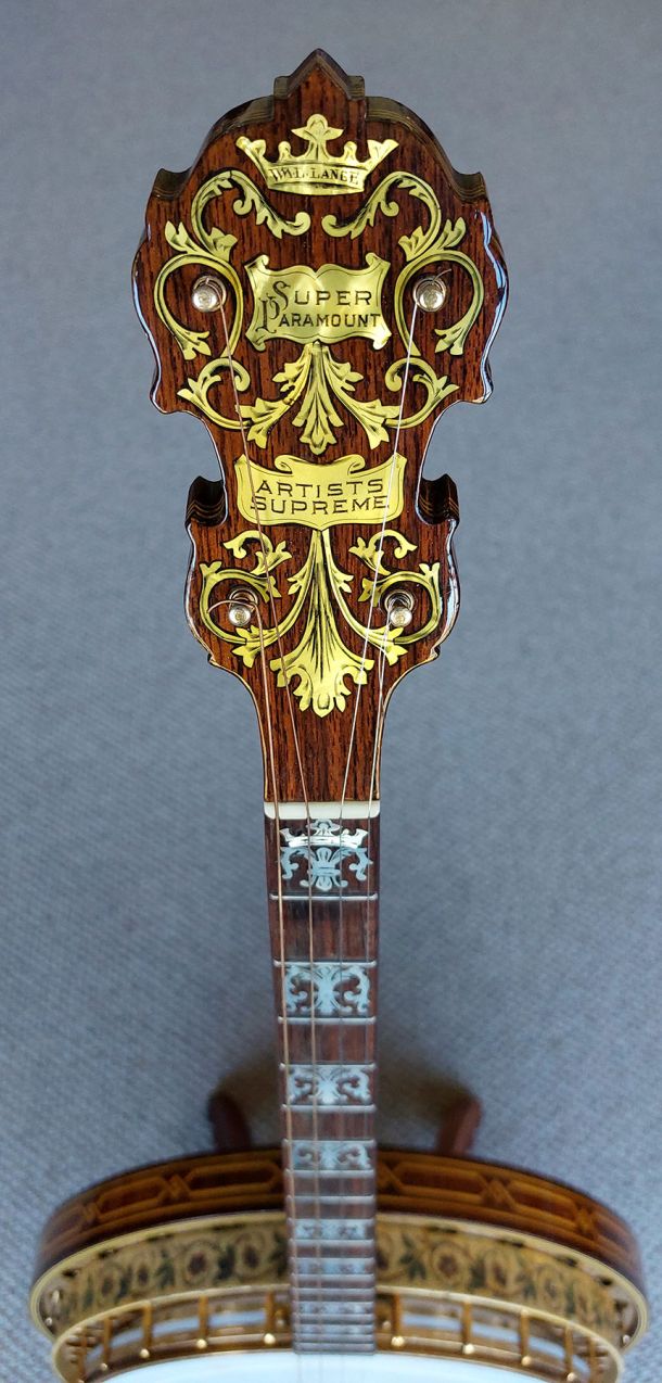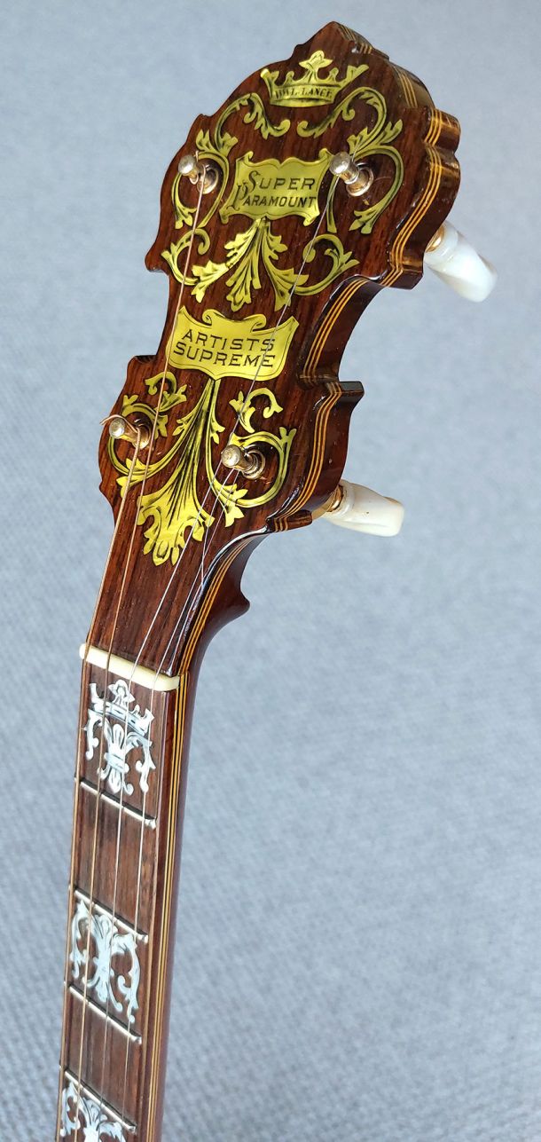 The most elaborate of the Super Paramount line was the Artists Supreme, with engraved inlays on the head and fingerboard, marquetry on the resonator, and an engraved celluloid sidewall. It is a spectacular instrument.