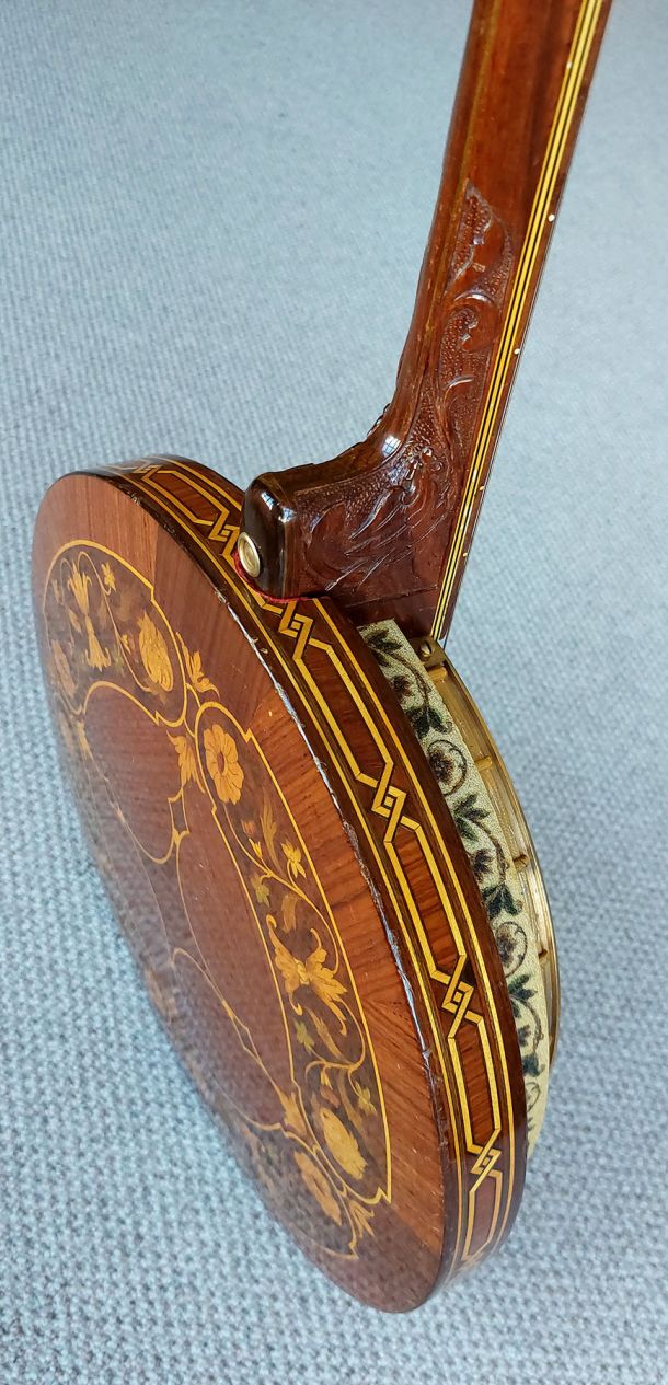 All Super Paramount banjos had a double stepped resonator, unique to Paramount, and not seen on any other banjo. All three models came with a large one piece tone modifier tailpiece mute. Fitted with Page tuners, rosewood neck and resonator with elaborate wood marquetry inlay. The fretboard is also rosewood with engraved fancy mother of pearl inlay position markers. The headstock mother of pearl is beautifully ornate MOP with multi laminated wood veeners. The unique Paramount double flange has an engraved cream celluloid sidewall on the upper flange, gold plated and fancy engraved hardware and a carved heel.
